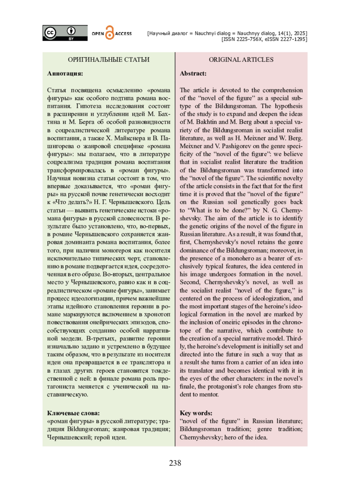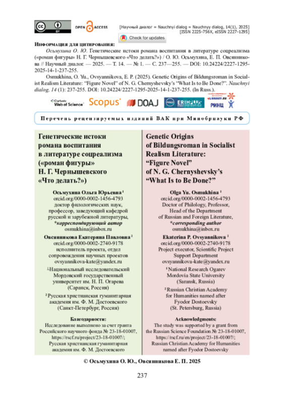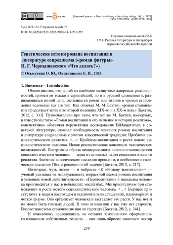 Статья посвящена осмыслению «романа фигуры» как особого подтипа романа воспитания. Гипотеза исследования состоит в расширении и углублении идей М. Бахтина и М. Берга об особой разновидности в соцреалистической литературе романа воспитания, а также Х. Майкснера и В. Пашигорева о жанровой специфике «романа фигуры»: мы полагаем, что в литературе соцреализма традиция романа воспитания трансформировалась в «роман фигуры». Научная новизна статьи состоит в том, что впервые доказывается, что «роман фигуры» на русской почве генетически восходит к «Что делать?» Н. Г. Чернышевского. Цель статьи — выявить генетические истоки «романа фигуры» в русской словесности. В результате было установлено, что, во-первых, в романе Чернышевского сохраняется жанровая доминанта романа воспитания, более того, при наличии моногероя как носителя исключительно типических черт, становлению в романе подвергается идея, сосредоточенная в его образе. Во-вторых, центральное место у Чернышевского, равно как и в соцреалистическом «романе фигуры», занимает процесс идеологизации, причем важнейшие этапы идейного становления героини в романе маркируются включением в хронотоп повествования онейрических эпизодов, способствующих созданию особой нарративной модели. В-третьих, развитие героини изначально задано и устремлено в будущее таким образом, что в результате из носителя идеи она превращается в ее транслятора и в глазах других героев становится тождественной с ней: в финале романа роль протагониста меняется с ученической на наставническую.