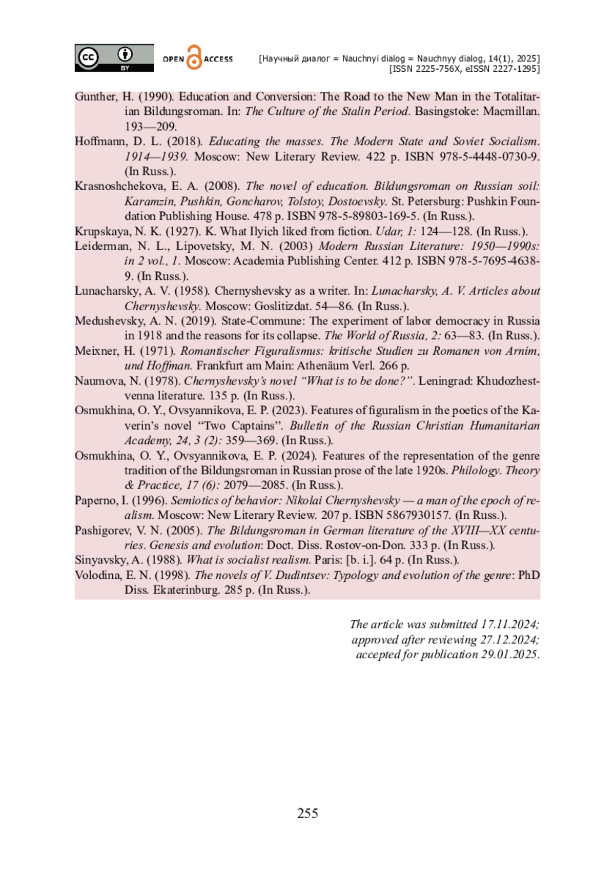 17. Осьмухина О. Ю. Особенности репрезентации жанровой традиции романа воспитания в русской прозе конца 1920-х годов / О. Ю. Осьмухина, Е. П. Овсянникова // Филологические науки. Вопросы теории и практики. Philology. Theory & Practice. - 2024. - Т. 17. - Выпуск 6. - С. 2079-2085.