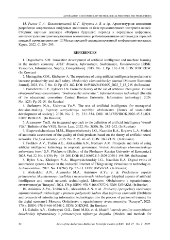 15. Рылов С. А., Благовещенский И. Г., Кучумов А. В. и др. Архитектурная концепция разработки современных цифровых двойников на базе промышленного интернета вещей. Сборник научных докладов “Фабрика будущего: переход к передовым цифровым, интеллектуальным производственным технологиям, роботизированным системам для отраслей пищевой промышленности” III Международной специализированной конференции-выставки. Курск, 2022. С. 284-293. EDN: MWBCMJ