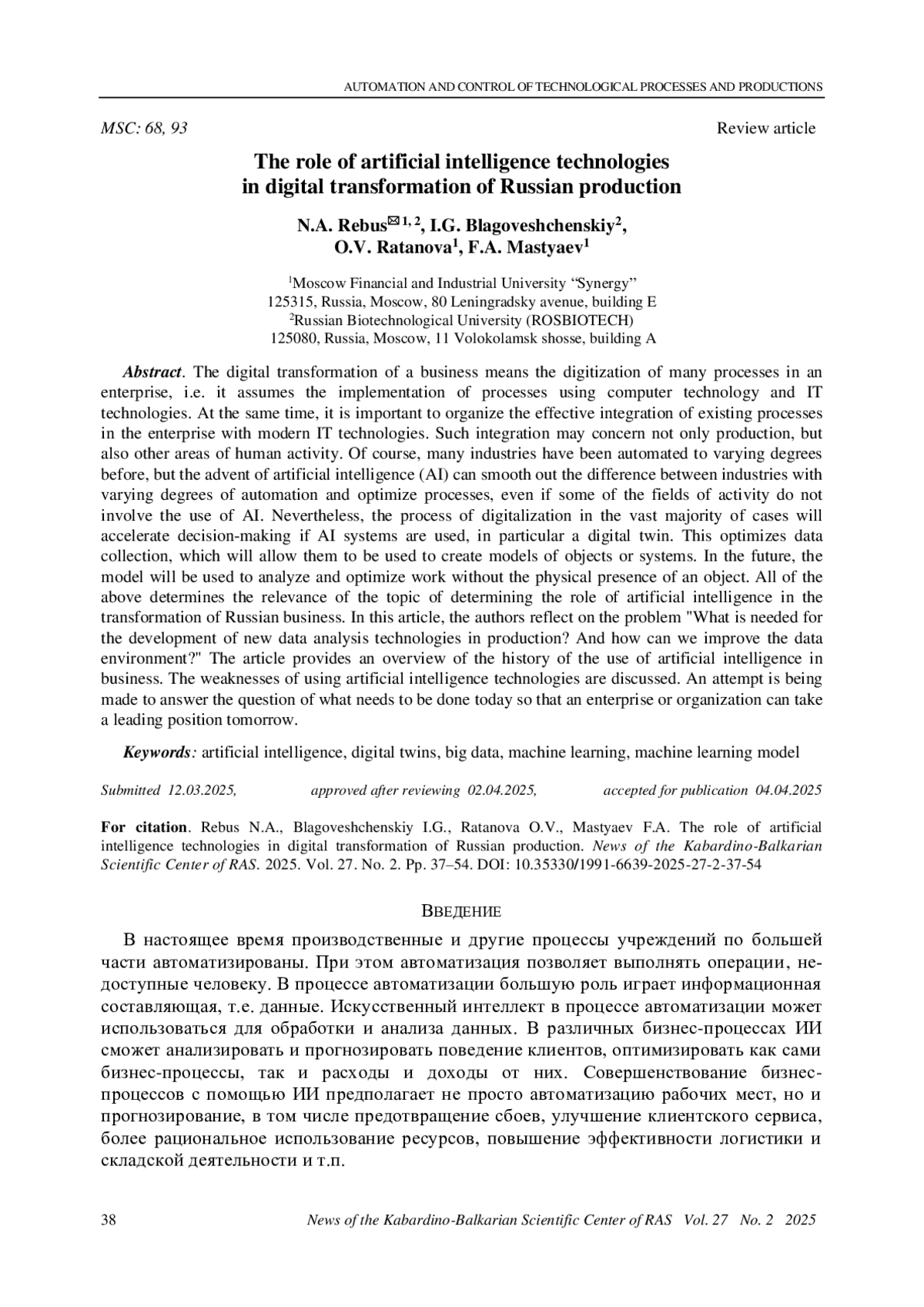 Цифровая трансформация бизнеса означает перевод многих процессов на предприятии в цифровой вид, т. е. предполагается выполнение процессов с использованием компьютерной техники и ИТ-технологий. При этом важно организовать эффективную интеграцию уже имеющихся на предприятии процессов с современными ИТ-технологиями. Такая интеграция может касаться не только производства, но и других областей человеческой деятельности. Конечно, и раньше многие отрасли в разной мере подвергались автоматизации, но появление искусственного интеллекта (ИИ) может сгладить разницу между отраслями с автоматизацией разной степени и позволит оптимизировать процессы, даже если какие-то из сфер деятельности не предполагают использование ИИ. Тем не менее процесс цифровизации в подавляющем большинстве случаев даст ускорение принятию решений, если использовать системы ИИ, в частности цифрового двойника. Это оптимизирует сбор данных, что позволит использовать их для создания моделей объектов или систем. Модель в дальнейшем будет применяться для анализа и оптимизации работы без физического присутствия объекта. Все вышеизложенное и определяет актуальность темы идентификации места и роли искусственного интеллекта в цифровой трансформации российского бизнеса. В данной статье авторы размышляют над проблемой «Какие шаги необходимо предпринять для развития новых технологий анализа данных в производстве? И как усовершенствовать среду работы с данными?». В статье дается обзор истории использования искусственного интеллекта в бизнесе. Обсуждаются слабые стороны применения технологий искусственного интеллекта. Предпринимается попытка дать ответ на вопрос: что нужно сделать уже сегодня, чтобы предприятие или организация могли занять лидирующие позиции завтра.