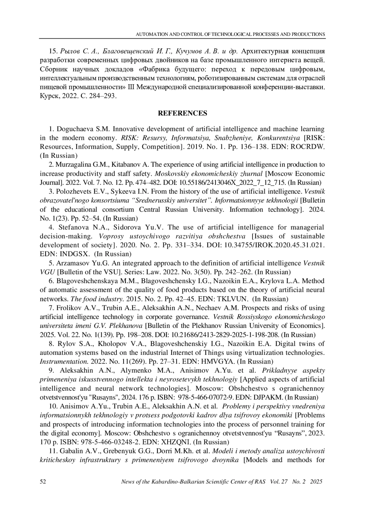 7. Фроликов А. В., Трубин А. Е., Алексахин А. Н., Нечаев А. М. Перспективы и риски применения технологии искусственного интеллекта в корпоративном управлении // Вестник Российского экономического университета имени Г. В. Плеханова. 2025. Т. 22. № 1(139). С. 198-208. DOI: 10.21686/2413-2829-2025-1-198-208 EDN: DLQPVC