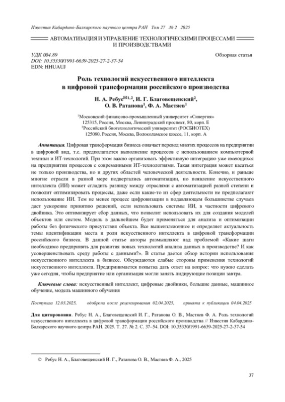 2. Мурзагалина Г. М., Китабанов А. Опыт применения искусственного интеллекта в производстве для повышения производительности и безопасности персонала // Московский экономический журнал. 2022. Т. 7. № 12. C. 474-482. Х_2022_7_12_715. DOI: 10.55186/2413046 EDN: GRSAFJ