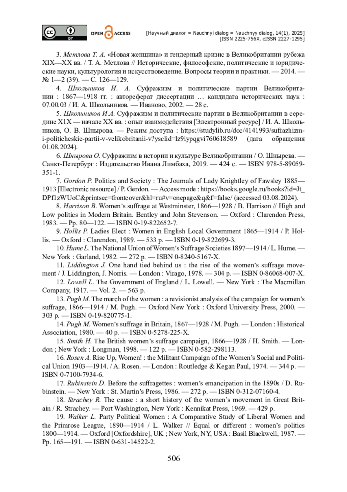 25. Школьников И.А. Суфражизм и политические партии в Великобритании в середине Х1Х - начале ХХ вв. : опыт взаимодействия [Электронный ресурс] / И. А. Школьников, О. В. Шнырова. - Режим доступа : https://studylib.ru/doc/4141993/sufrazhizm-i-politicheskie-partii-v-velikobritanii-v?ysclid=lz9iypqgvi760618589 (дата обращения 01.08.2024).