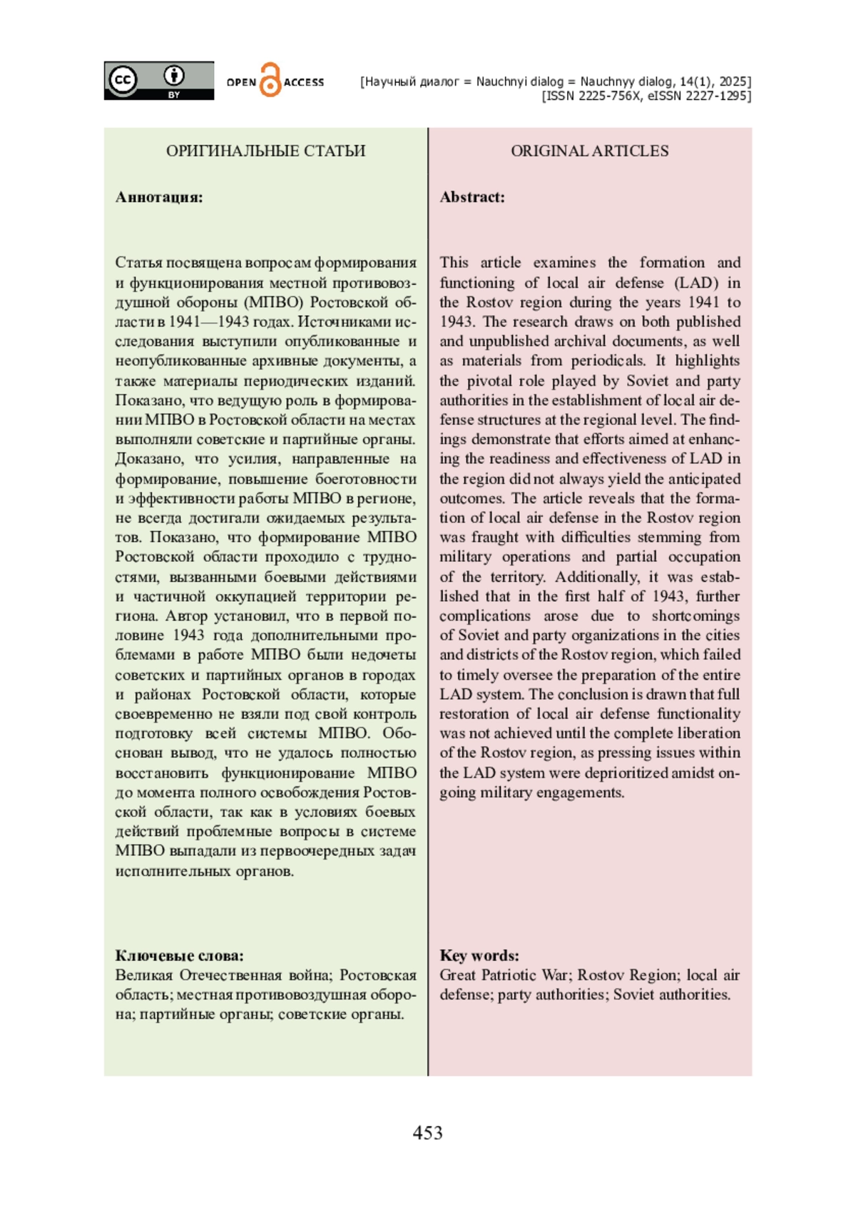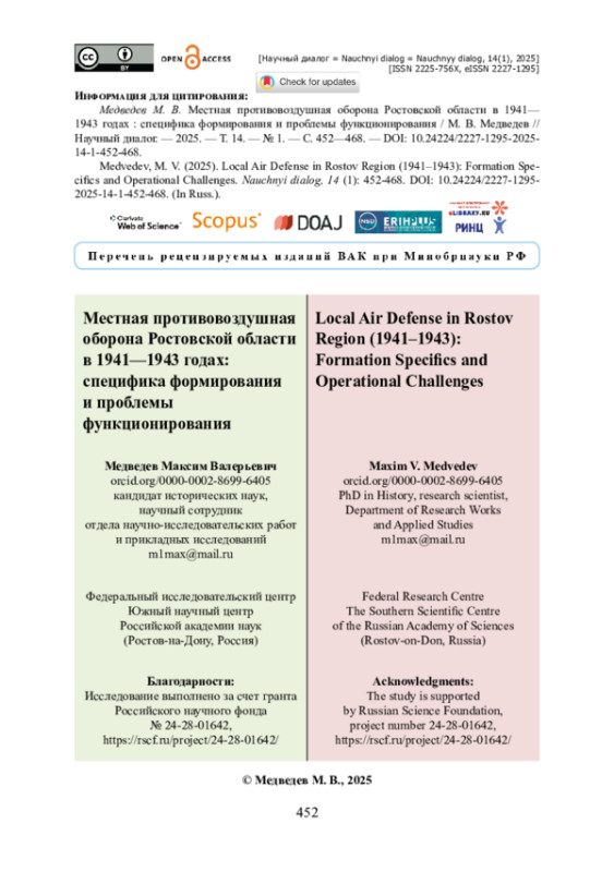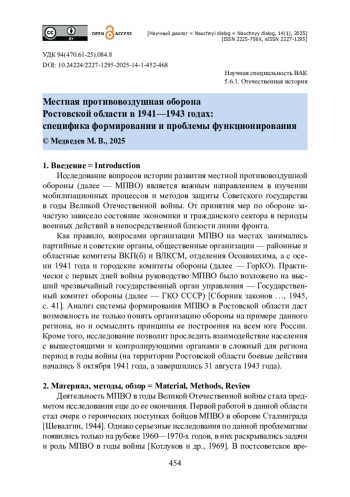 Статья посвящена вопросам формирования и функционирования местной противовоздушной обороны (МПВО) Ростовской области в 1941—1943 годах. Источниками исследования выступили опубликованные и неопубликованные архивные документы, а также материалы периодических изданий. Показано, что ведущую роль в формировании МПВО в Ростовской области на местах выполняли советские и партийные органы. Доказано, что усилия, направленные на формирование, повышение боеготовности и эффективности работы МПВО в регионе, не всегда достигали ожидаемых результатов. Показано, что формирование МПВО Ростовской области проходило с трудностями, вызванными боевыми действиями и частичной оккупацией территории региона. Автор установил, что в первой половине 1943 года дополнительными проблемами в работе МПВО были недочеты советских и партийных органов в городах и районах Ростовской области, которые своевременно не взяли под свой контроль подготовку всей системы МПВО. Обоснован вывод, что не удалось полностью восстановить функционирование МПВО до момента полного освобождения Ростовской области, так как в условиях боевых действий проблемные вопросы в системе МПВО выпадали из первоочередных задач исполнительных органов.