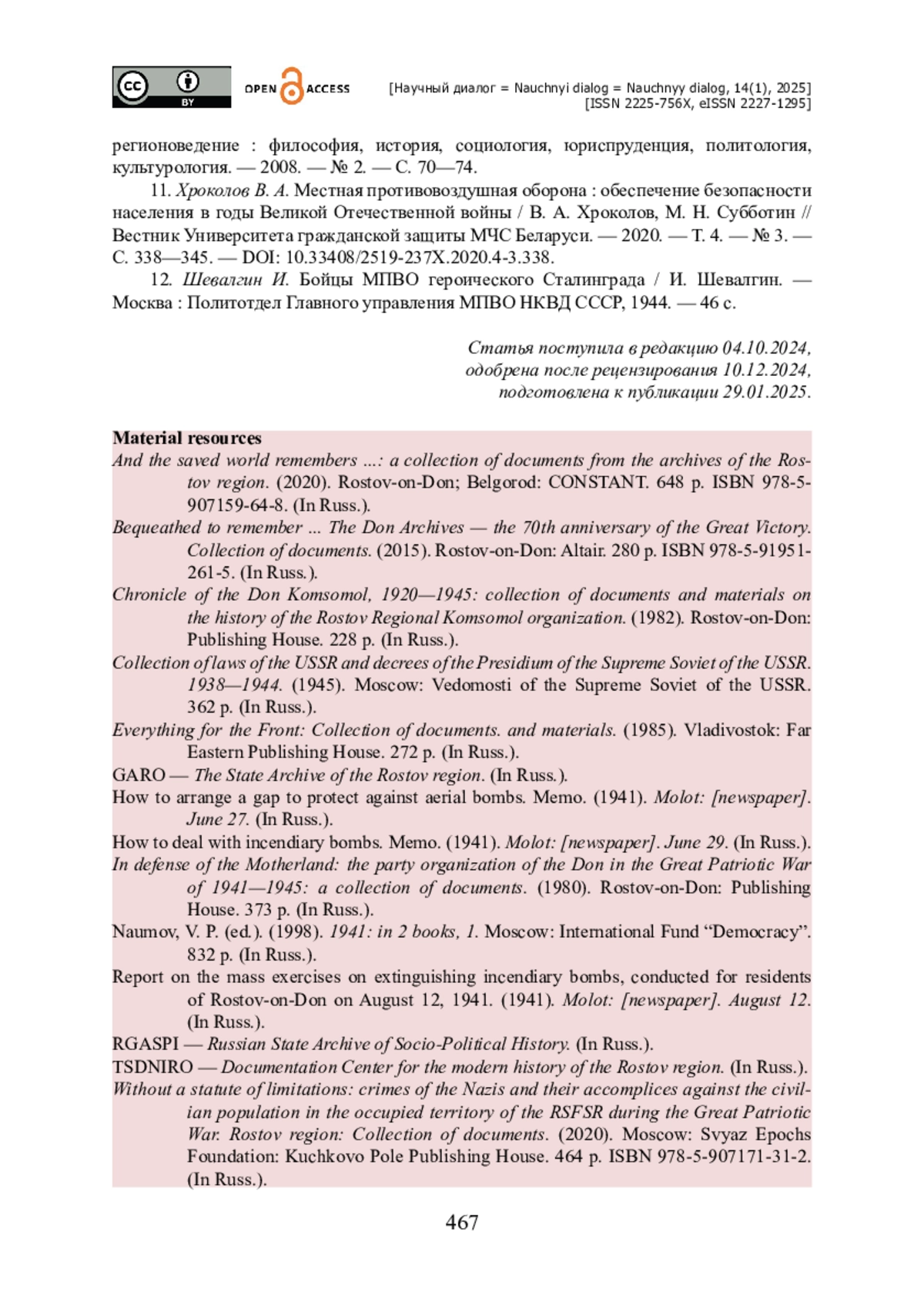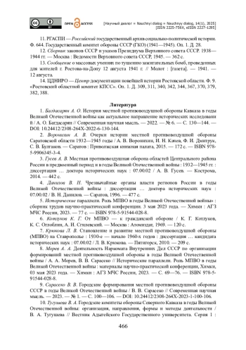 15. Багдасарян А. О. История местной противовоздушной обороны Кавказа в годы Великой Отечественной войны как актуальное направление исторических исследований / А. О. Багдасарян // Современная научная мысль. - 2022. - № 6. - С. 130-144. - https://doi.org/10.24412/2308-264X-2022-6-130-144.