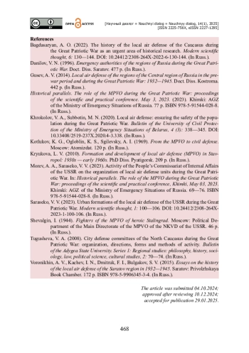 19. Исторические параллели. Роль МПВО в годы Великой Отечественной войны» : сборник трудов научно-практической конференции. 3 мая 2023 года. - Химки : АГЗ МЧС России, 2023. - 77 с. - ISBN 978-5-91544-028-8.