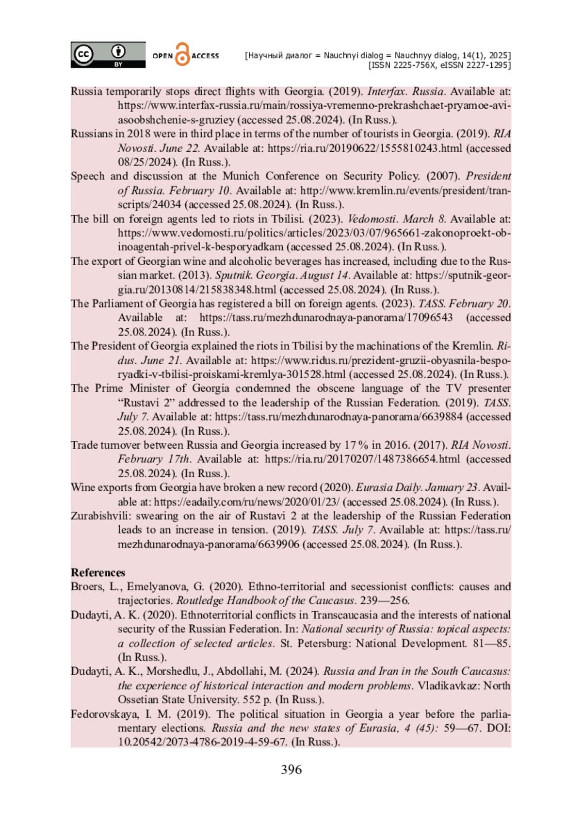 42. Suleymanov E. A. Unrecognized states as a means of coercive diplomacy? Assessing the role of Abkhazia and South Ossetia in Russia’s foreign policy in the South Caucasus / E. A. Suleymanov, E. Abrahamyan, H. Aliyev // Southeast European and Black Sea Studies. - 2018. - Vol. 18. - № 1. - Pp. 73-86. - https://doi.org/10.1080/14683857.2017.1390830.