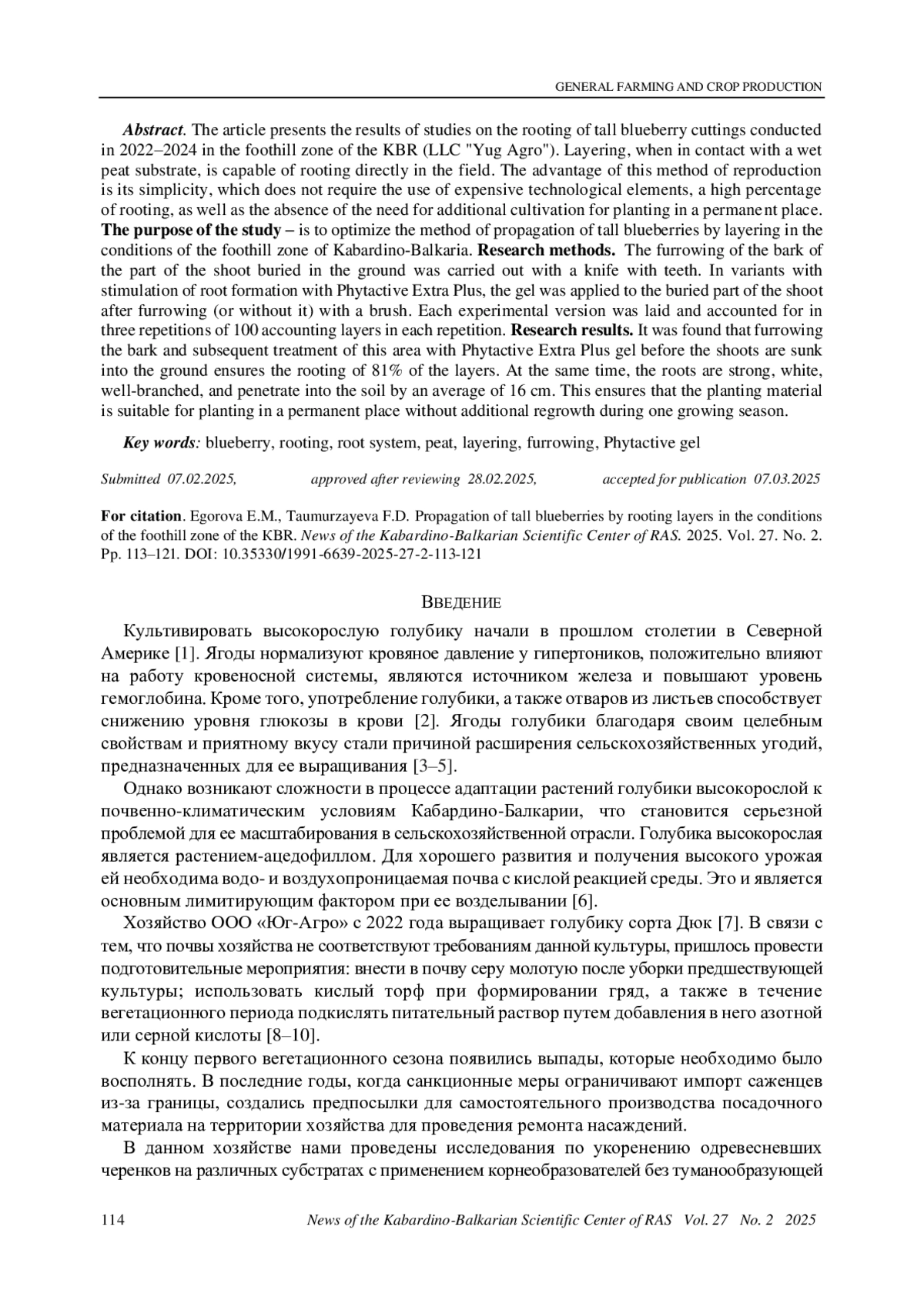 11. Егорова Е. М., Таумурзаева Ф. Д. Укоренение одревесневших черенков голубики высокорослой без применения туманообразующей системы // Известия Кабардино-Балкарского научного центра РАН. 2025. Т. 27. № 1. С. 11-19. DOI: 10.35330/1991-6639-2025-27-1-11-19 EDN: BYIEDX
