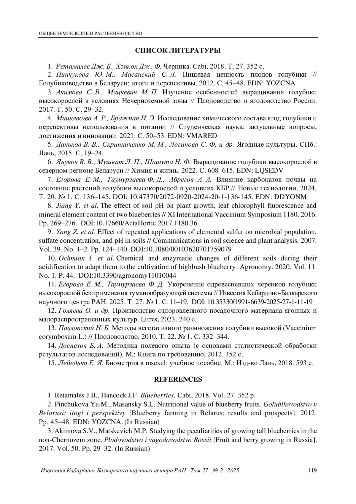 10. Ochmian I. et al. Chemical and enzymatic changes of different soils during their acidification to adapt them to the cultivation of highbush blueberry. Agronomy. 2020. Vol. 11. No. 1. P. 44. DOI: 10.3390/agronomy11010044 EDN: CPGNAW