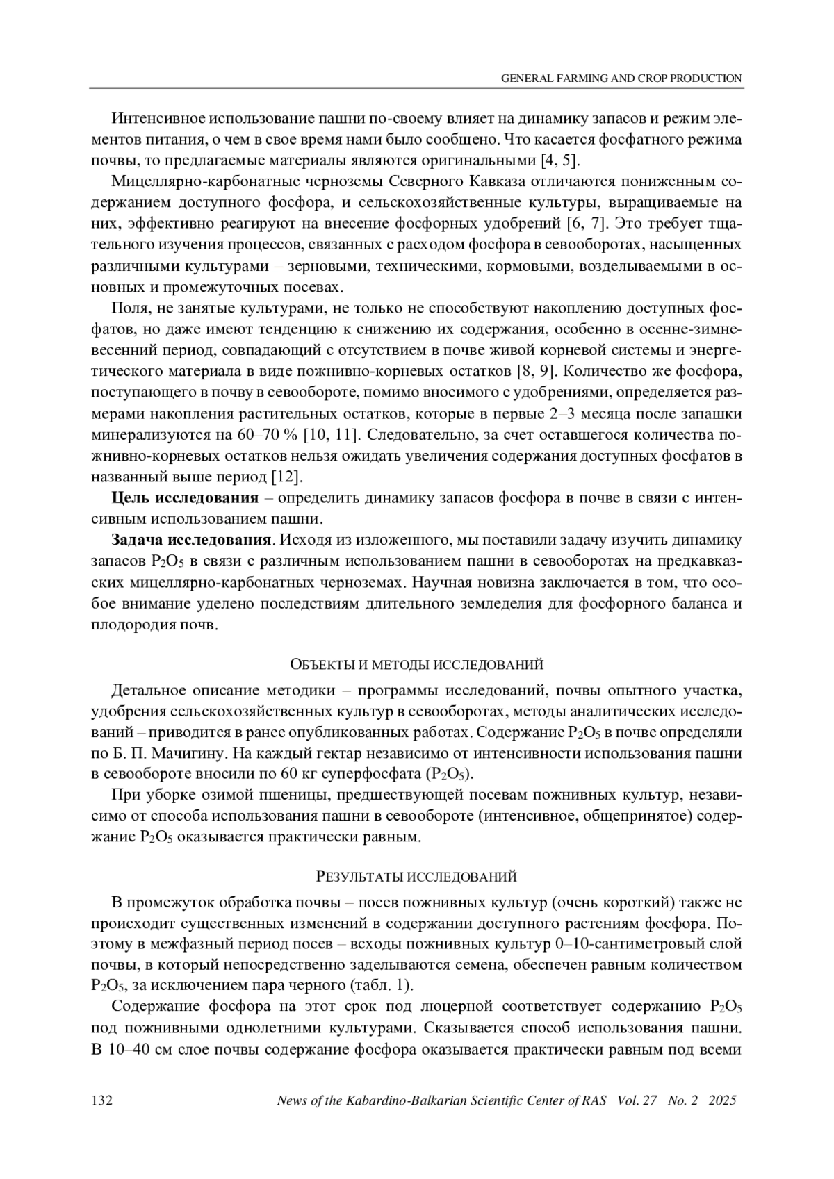 В статье приведены результаты исследований по одной из самых актуальных проблем - динамика запасов фосфора в почве в условиях интенсивного использования пашни, в том числе основные факторы, влияющие на изменение содержания фосфора, включая агротехнические практики, внесение удобрений, эрозию почвы и биологическую активность. Цель исследования - определить динамику запасов фосфора в почве в связи с интенсивным использованием пашни. Научная новизна заключается в том, что особое внимание уделено последствиям длительного земледелия для фосфорного баланса и плодородия почв. Закладка опытов, наблюдения и учеты выполнялись по методике, принятой в агрономии. В результате исследований важно отметить, что содержание фосфора на этот срок под люцерной соответствует содержанию Р2О5 под пожнивными однолетними культурами. В 10-40-сантиметровом слое почвы содержание фосфора оказывается практически равным под всеми культурами и черным паром, но на 23-12 % меньше по сравнению с полем, подвергающимся полупаровой обработке. А в 40-100 см слое почвы выравнивается содержание P2O5 под люцерной, черным паром, зябью и оказывается на 14-28 % меньше по сравнению с пожнивными посевами однолетних культур, т. е. наблюдается обратная картина по сравнению с вышележащими слоями почвы, что обусловливается перераспределяющей ролью корневой системы и разложением пожнивно-корневых остатков. А относительно исследований по динамике Р2О5 в зависимости от способа использования пашни и предшественников под вика-ржаной смесью важно отметить, что мощно развитая корневая система люцерны повышает подвижность фосфатов. В анализируемый период только корневая система люцерны в 40-100 см слое почвы поддерживает активность фосфора. В полях, не занятых растениями, фосфор связывается в малоподвижные формы. Аналогичная картина характерна для всего метрового слоя почвы. По результатам проведенных исследований можно сказать, что фосфор, входящий в состав пожнивно-корневых остатков ранее произрастающих на поле культур, застрахован от возможных превращений в почве и подобно содержащемуся в навозе легко доступен к этому времени новому поколению растений (озимым - основным и промежуточным, кукурузе и т. д.). Поэтому удержание N, Р2О5, К2О и других макро- и микроэлементов из удобрений и почвы в пожнивно-корневых остатках растений представляет, хотя и известное, но по-настоящему активно еще не используемое явление.