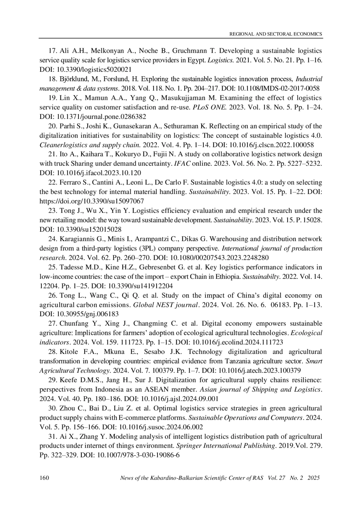 17. Ali A.H., Melkonyan A., Noche B., Gruchmann T. Developing a sustainable logistics service quality scale for logistics service providers in Egypt. Logistics. 2021. Vol. 5. No. 21. Pp. 1-16. DOI: 10.3390/logistics5020021 EDN: NDLDJU