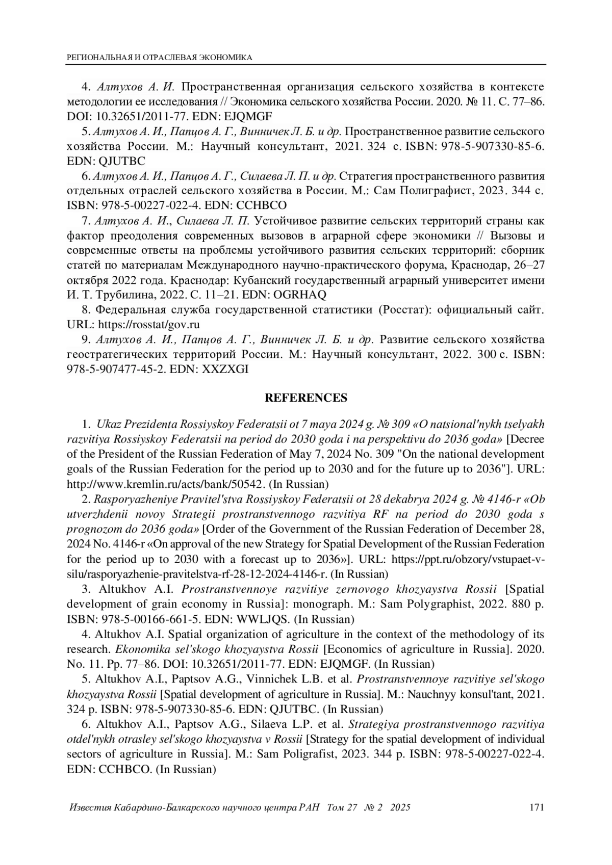 9. Алтухов А. И., Папцов А. Г., Винничек Л. Б. и др. Развитие сельского хозяйства геостратегических территорий России. М.: Научный консультант, 2022. 300 с. ISBN: 978-5-907477-45-2 EDN: XXZXGI