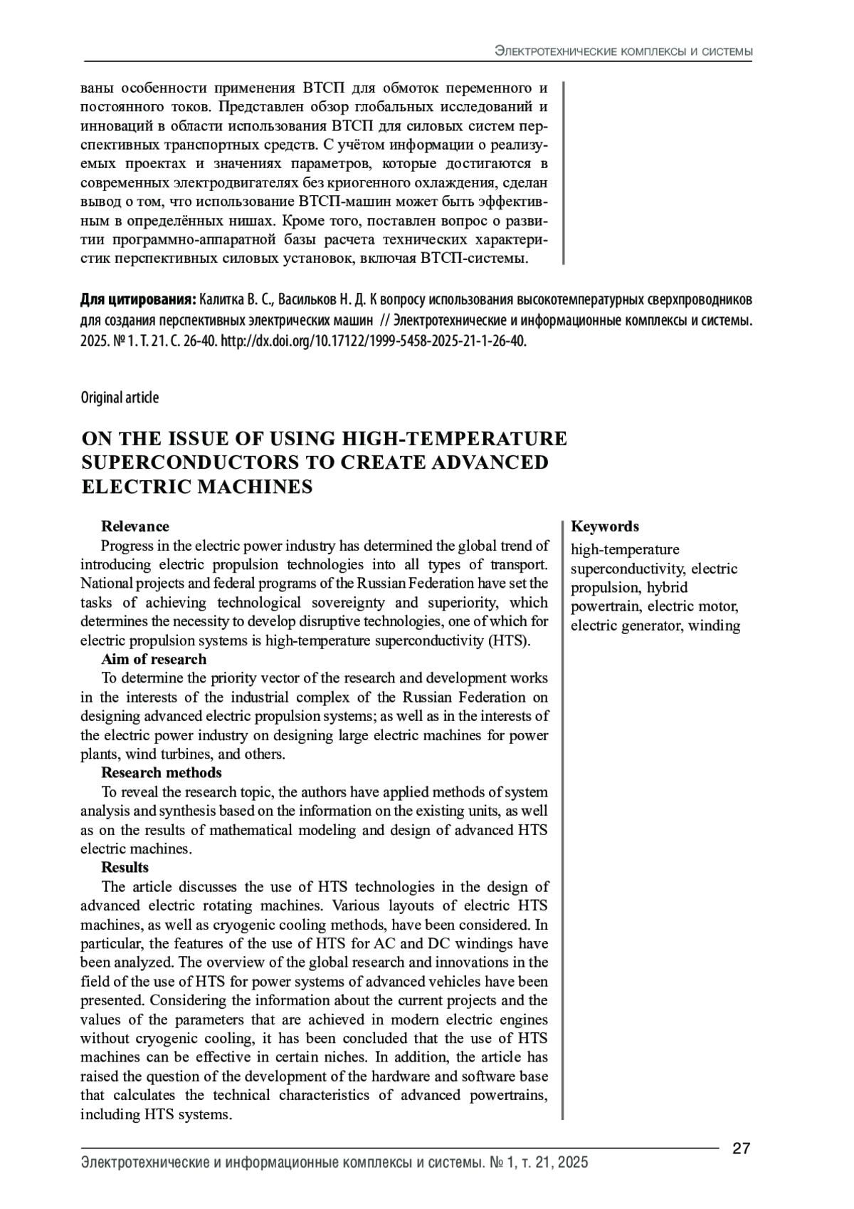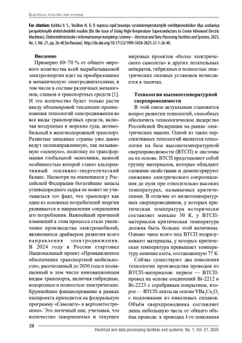 Актуальность Прогресс в сфере электроэнергетики определил общемировую тенденцию внедрения во все виды транспорта технологий электродвижения. В рамках национальных проектов и федеральных программ Российской Федерации ставятся задачи достижения технологического суверенитета и превосходства, что определяет необходимость развития прорывных технологий, одной из которых для систем электродвижения является высокотемпературная сверхпроводимость (ВТСП). Цель исследования Определение приоритетного вектора научно-исследовательских и опытно-конструкторских работ в интересах промышленного комплекса Российской Федерации по созданию перспективных систем электродвижения, а также электроэнергетики по созданию крупных электрических машин для электростанций, ветрогенераторов и прочего. Методы исследования Для раскрытия темы исследования применялись методы системного анализа и синтеза, основанные на информации по существующим агрегатам, а также результатах математического моделирования и проектирования перспективных ВТСП-электрических машин. Результаты В статье рассмотрен вопрос об использовании ВТСП-технологий при создании перспективных электрических вращающихся машин. Рассмотрены различные компоновки электрических ВТСП-машин, а также методы криогенного охлаждения. В частности, проанализированы особенности применения ВТСП для обмоток переменного и постоянного токов. Представлен обзор глобальных исследований и инноваций в области использования ВТСП для силовых систем перспективных транспортных средств. С учётом информации о реализуемых проектах и значениях параметров, которые достигаются в современных электродвигателях без криогенного охлаждения, сделан вывод о том, что использование ВТСП-машин может быть эффективным в определённых нишах. Кроме того, поставлен вопрос о развитии программно-аппаратной базы расчета технических характеристик перспективных силовых установок, включая ВТСП-системы.