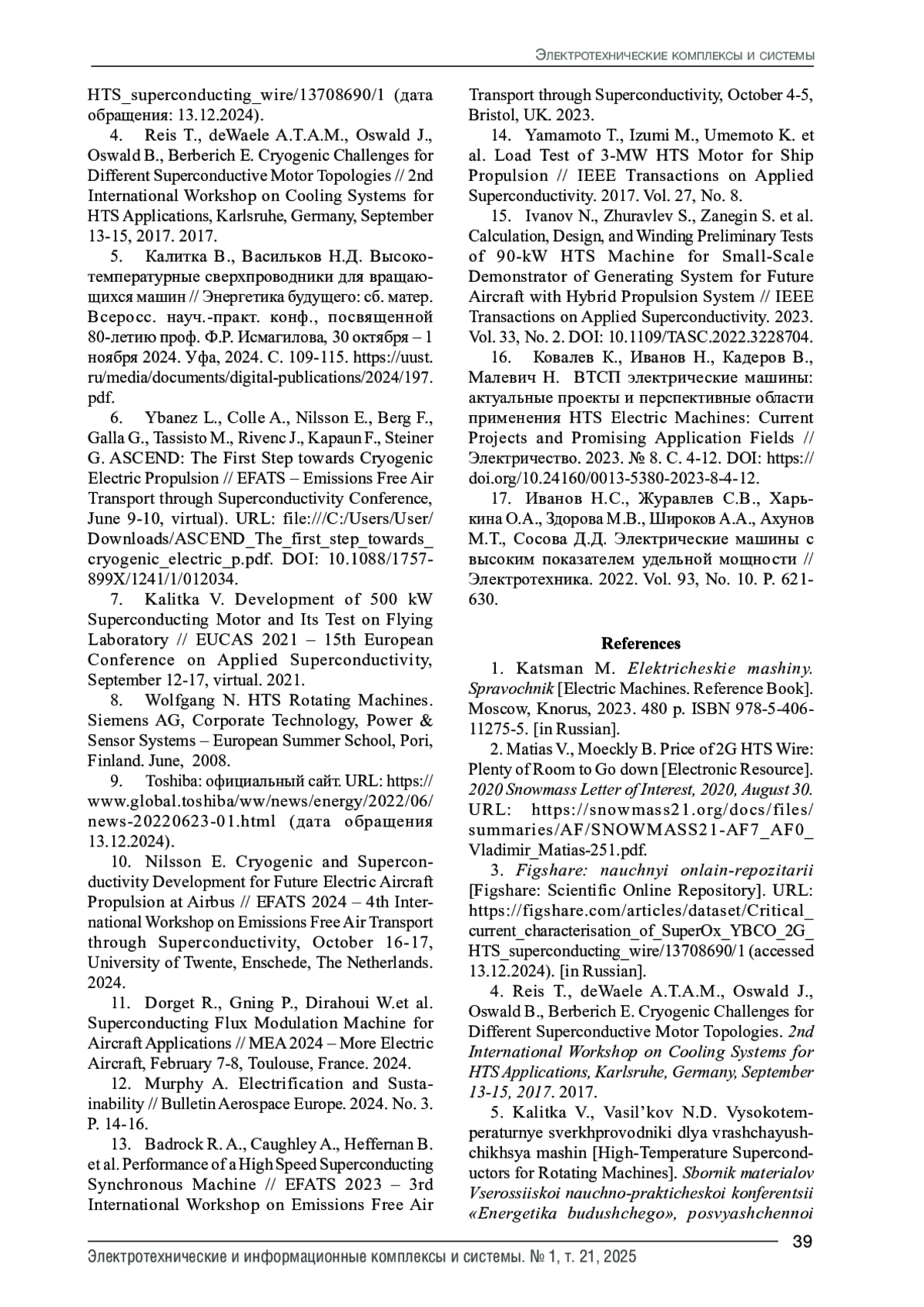 17. Иванов Н.С., Журавлев С.В., Харькина О.А., Здорова М.В., Широков А.А., Ахунов М.Т., Сосова Д.Д. Электрические машины с высоким показателем удельной мощности // Электротехника. 2022. Vol. 93, No. 10. P. 621- 630.