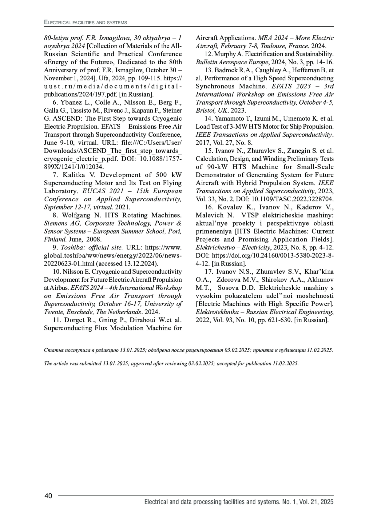 15. Ivanov N., Zhuravlev S., Zanegin S. et al. Calculation, Design, and Winding Preliminary Tests of 90-kW HTS Machine for Small-Scale Demonstrator of Generating System for Future Aircraft with Hybrid Propulsion System // IEEE Transactions on Applied Superconductivity. 2023. Vol. 33, No. 2. DOI: 10.1109/TASC.2022.3228704