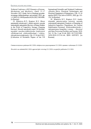 23. Хазиева Р.Т., Купцов Д.В. Обзор патентных исследований в области устройств заряда емкостных накопителей // Сборник научных трудов VII Международной научно-технической конференции “Электропривод, электротехнологии и электрооборудование предприятий”, Уфа, 13-16 апреля 2022. Уфа: Изд-во УГНТУ, 2022. С. 132-138. EDN: VQOIUU