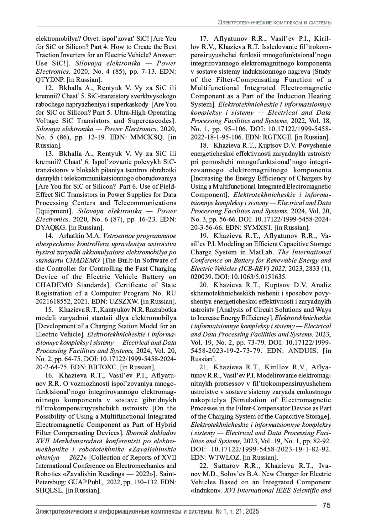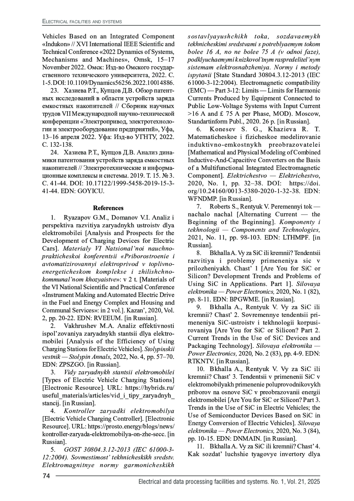 15. Хазиева Р.Т., Кантюков Н.Р. Разработка модели зарядной станции для электромобиля // Электротехнические и информационные комплексы и системы. 2024. Т. 20. № 2. С. 64-75. DOI: 10.17122/1999-5458-2024-20-2-64-75 EDN: BBTOXC