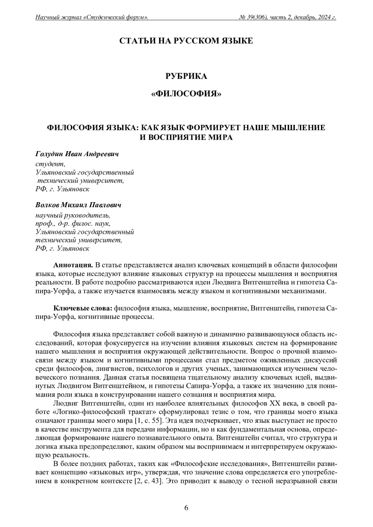 Голудин, И. А. Философия языка: как язык формирует наше мышление и восприятие мира / И. А. Голудин // Студенческий форум. – 2024. – № 39-2(306). – С. 6-8.