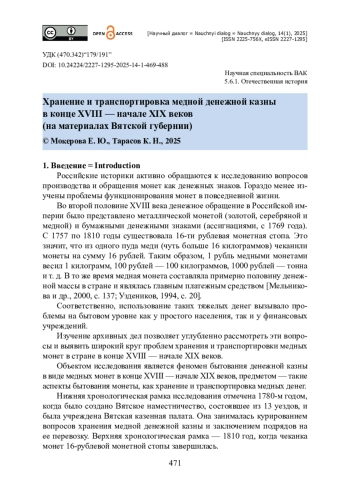 Исследуются вопросы бытования медных монет в России конца XVIII — начала XIX веков на материалах Вятского наместничества (губернии), а именно: хранение медной казны и ее транспортировка внутри и за пределы региона. Источниковую базу исследования составили материалы Центрального государственного архива Кировской области: журналы заседаний Вятской казенной палаты, документы о постройке и ремонте кладовых для хранения денежной казны в уездных городах, отчеты Казенной палаты, сведения о заключении подрядов с купцами и крестьянами на доставку медной монеты, отчеты о продвижении судов с медной монетой по пути в столицу и др. Изучен вопрос о планах строительства в уездных городах особых помещений кладовых для хранения медной казны. Установлено, что на протяжении изучаемого периода, несмотря на попытки найти решение Вятской казенной палатой, существующие проблемы хранения значительных масс медной монеты не были разрешены. Исследование показало, что транспортировка медной казны (в объеме нескольких десятков, а подчас и сотен тонн медных монет) за пределы Вятской губернии предполагала решение Вятской казенной палатой целого комплекса проблем (заключение подрядов, постройка судов, сбор судовых команд, обеспечение охраны и т. п.). Сделан вывод о том, что Вятская казенная палата умела гибко реагировать на возникающие трудности, благодаря чему срывов казенных подрядов по доставлению денежной казны в назначенные правительством пункты практически не было.