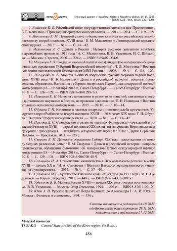 17. Соловьёва И. А. Становление казначейства в Вятско-Камском регионе в конце XVIII - начале XX в. / И. А. Соловьева // Вестник Вятского государственного гуманитарного университета. - 2012. - № 4. - С. 37-40.