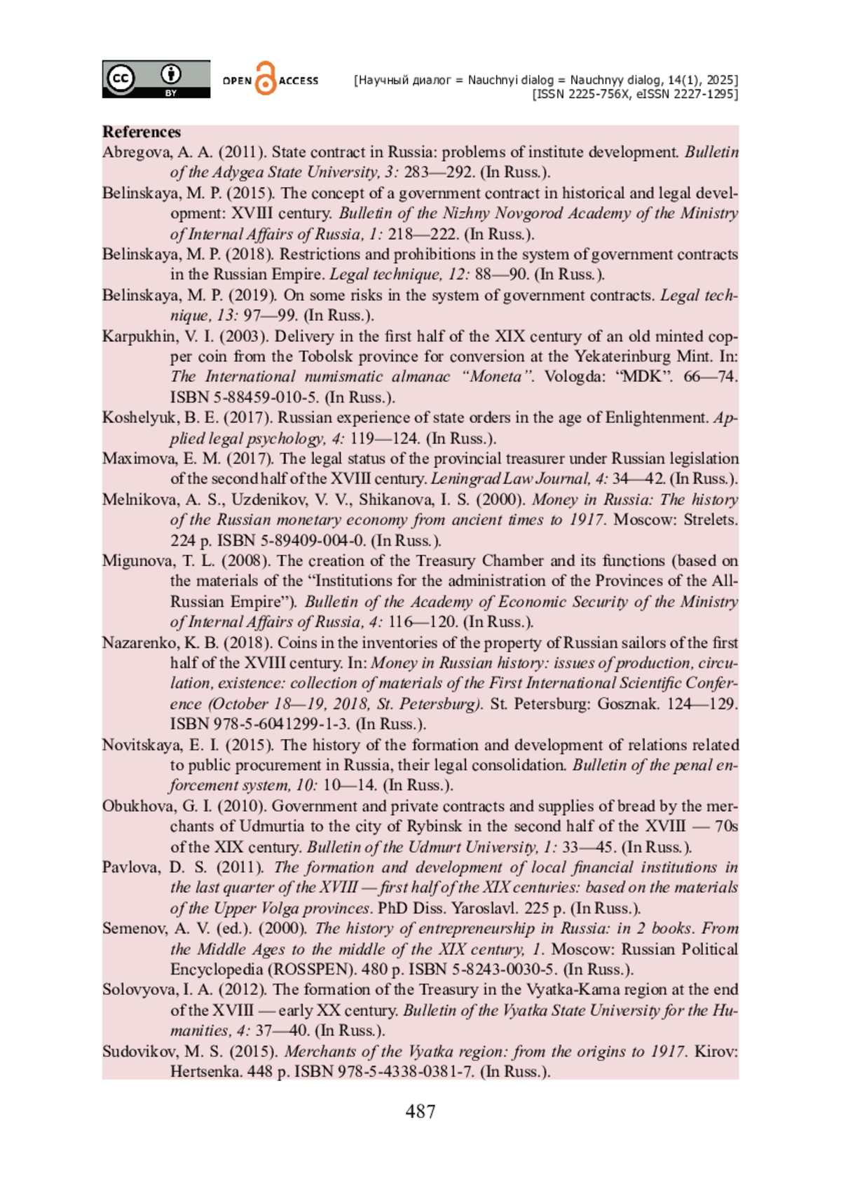 3. Белинская М. П. Ограничения и запреты в системе казенных подрядов в Российской империи / М. П. Белинская // Юридическая техника. - 2018. - № 12. - С. 88-90.