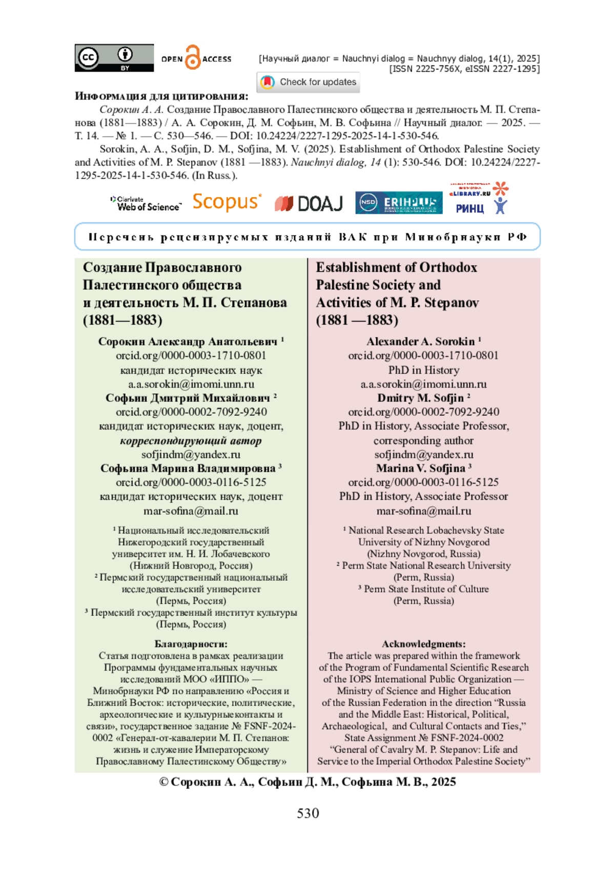 Статья посвящена участию в становлении Православного Палестинского общества, состоящего при великом князе Сергее Александровиче офицера Генерального штаба Михаила Петровича Степанова, который впоследствии был одним из ключевых руководителей общества в течение первых 35 лет существования организации. На основе как опубликованных материалов, так и документов, отложившихся в фондах Архива внешней политики Российской Империи (Москва), Российского государственного военно-исторического архива (Москва) и отдела рукописей Российской национальной библиотеки (Санкт-Петербург), показана роль М. П. Степанова в создании и первых шагах Палестинского общества. Рассматриваются обстоятельства назначения М. П. Степанова состоящим при великом князе и особенности его служебной деятельности. Особое внимание уделяется участию М. П. Степанова в паломнической поездке великого князя на Святую Землю в 1881 году, контактам М. П. Степанова с начальником Русской духовной миссии в Иерусалиме архимандритом Антонином (Капустиным), процессу подготовки к учреждению в 1882 году Палестинского общества. Рассматриваются причины и обстоятельства назначения М. П. Степанова секретарем общества в контексте кадровой политики организации, учитывавшей баланс различных сил, сторон и влияний.