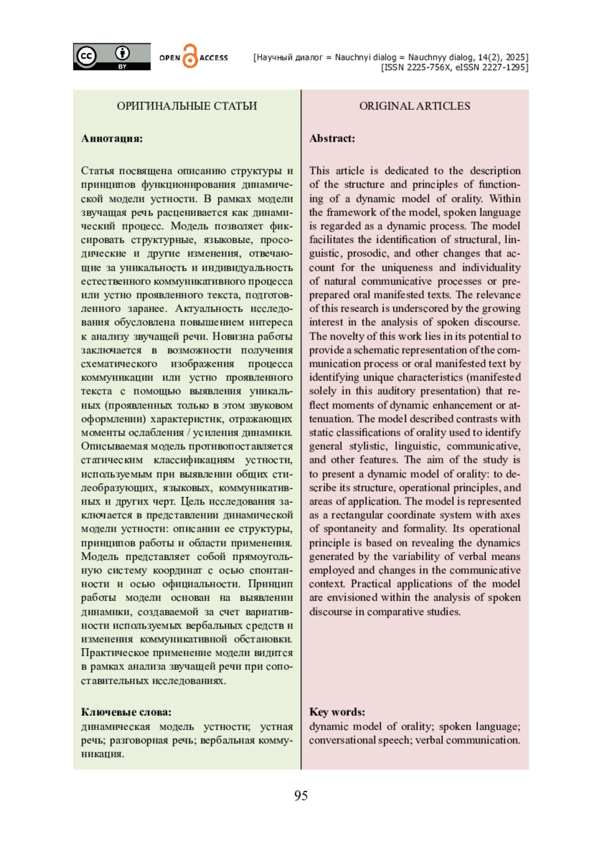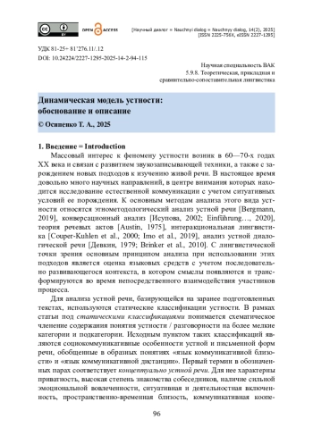 Статья посвящена описанию структуры и принципов функционирования динамической модели устности. В рамках модели звучащая речь расценивается как динамический процесс. Модель позволяет фиксировать структурные, языковые, просодические и другие изменения, отвечающие за уникальность и индивидуальность естественного коммуникативного процесса или устно проявленного текста, подготовленного заранее. Актуальность исследования обусловлена повышением интереса к анализу звучащей речи. Новизна работы заключается в возможности получения схематического изображения процесса коммуникации или устно проявленного текста с помощью выявления уникальных (проявленных только в этом звуковом оформлении) характеристик, отражающих моменты ослабления / усиления динамики. Описываемая модель противопоставляется статическим классификациям устности, используемым при выявлении общих стилеобразующих, языковых, коммуникативных и других черт. Цель исследования заключается в представлении динамической модели устности: описании ее структуры, принципов работы и области применения. Модель представляет собой прямоугольную систему координат с осью спонтанности и осью официальности. Принцип работы модели основан на выявлении динамики, создаваемой за счет вариативности используемых вербальных средств и изменения коммуникативной обстановки. Практическое применение модели видится в рамках анализа звучащей речи при сопоставительных исследованиях.
