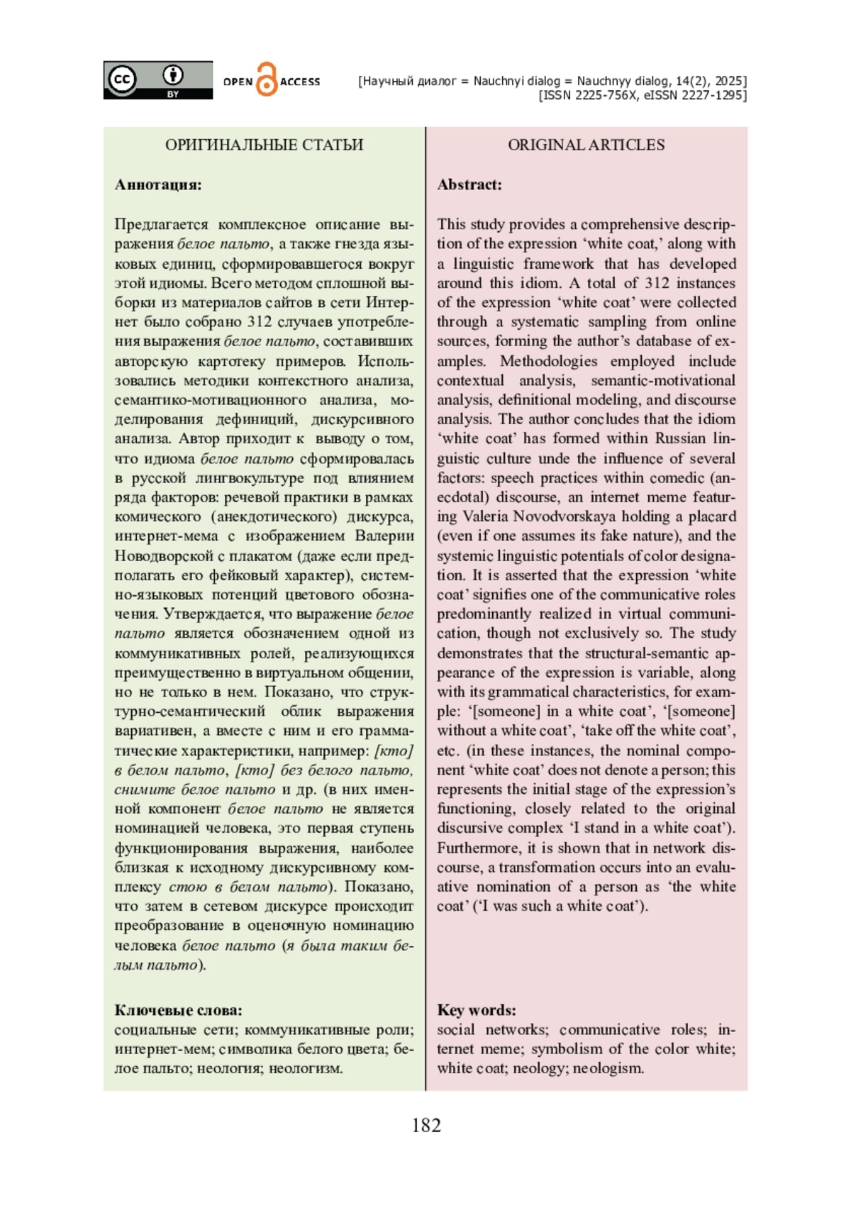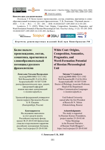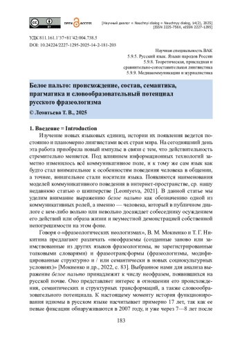Предлагается комплексное описание выражения белое пальто, а также гнезда языковых единиц, сформировавшегося вокруг этой идиомы. Всего методом сплошной выборки из материалов сайтов в сети Интернет было собрано 312 случаев употребления выражения белое пальто, составивших авторскую картотеку примеров. Использовались методики контекстного анализа, семантико-мотивационного анализа, моделирования дефиниций, дискурсивного анализа. Автор приходит к выводу о том, что идиома белое пальто сформировалась в русской лингвокультуре под влиянием ряда факторов: речевой практики в рамках комического (анекдотического) дискурса, интернет-мема с изображением Валерии Новодворской с плакатом (даже если предполагать его фейковый характер), системно-языковых потенций цветового обозначения. Утверждается, что выражение белое пальто является обозначением одной из коммуникативных ролей, реализующихся преимущественно в виртуальном общении, но не только в нем. Показано, что структурно-семантический облик выражения вариативен, а вместе с ним и его грамматические характеристики, например: [кто] в белом пальто, [кто] без белого пальто, снимите белое пальто и др. (в них именной компонент белое пальто не является номинацией человека, это первая ступень функционирования выражения, наиболее близкая к исходному дискурсивному комплексу стою в белом пальто). Показано, что затем в сетевом дискурсе происходит преобразование в оценочную номинацию человека белое пальто (я была таким белым пальто).