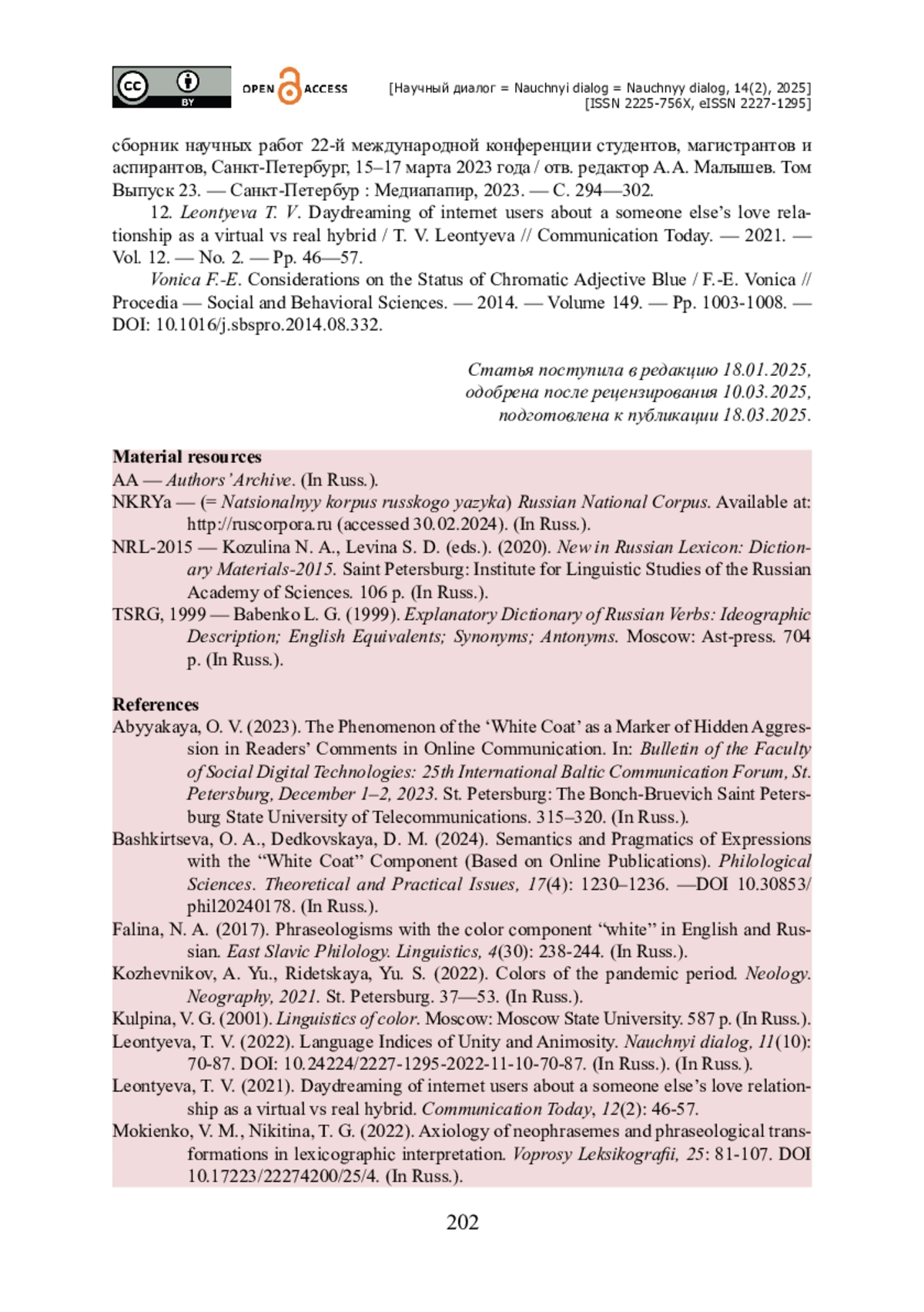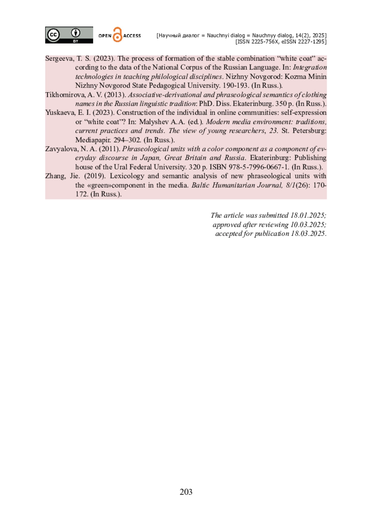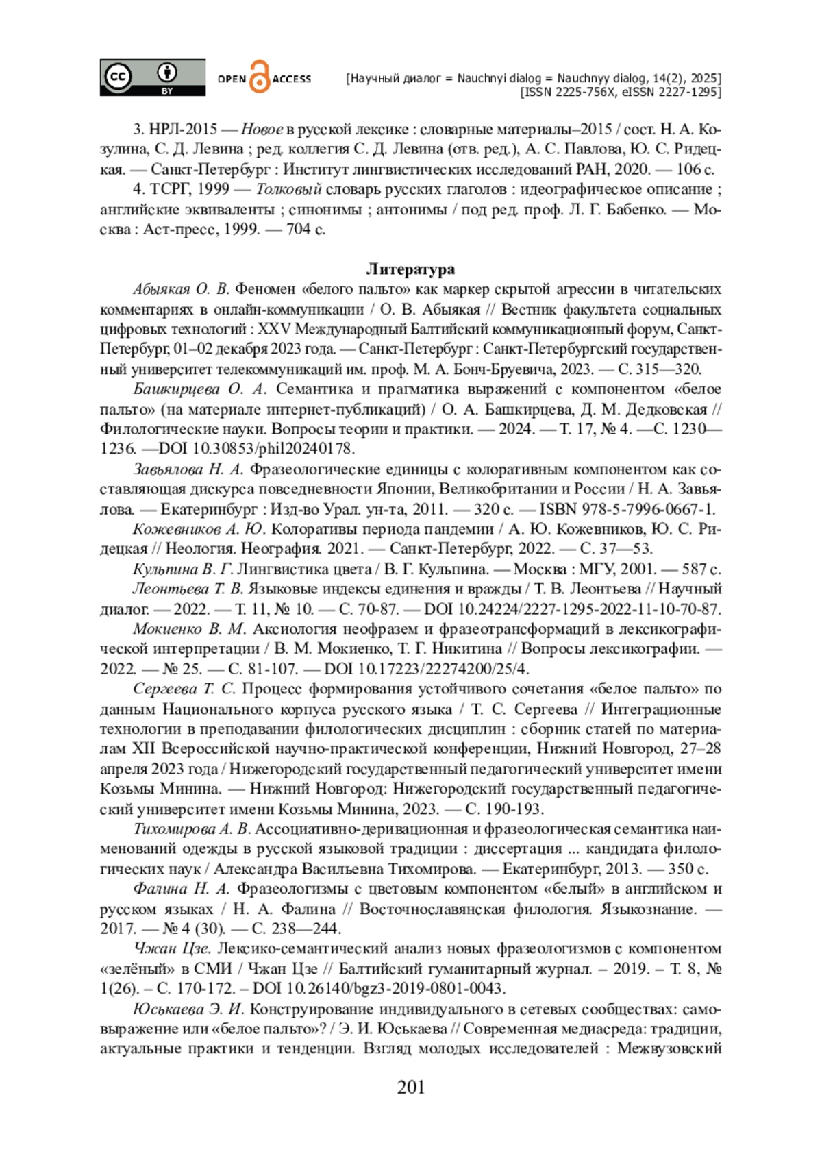 2. Башкирцева О. А. Семантика и прагматика выражений с компонентом «белое пальто» (на материале интернет-публикаций) / О. А. Башкирцева, Д. М. Дедковская // Филологические науки. Вопросы теории и практики. - 2024. - Т. 17, № 4. -С. 1230- 1236. -DOI 10.30853/phil20240178.