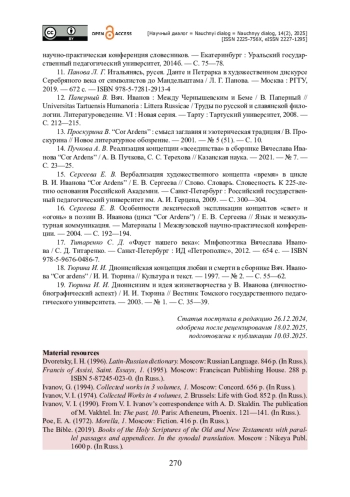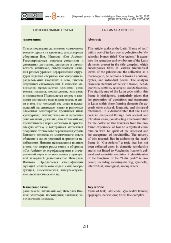 Статья посвящена латинскому «рамочному тексту» одного из ключевых стихотворных сборников Вяч. Иванова «Cor Ardens». Рассматриваются вопросы семантики и символики латинских элементов в заголовочном комплексе, объединяющем названия разных уровней иерархической структуры издания: сборника как макро-цикла, разделов-книг, входящих в него, циклов, отдельных стихотворений. В качестве материалов привлекаются элементы рамы текста: заглавия, подзаголовки, эпиграфы и посвящения. Поднимается вопрос о важности латинского кода в раме текста, в связи с тем, что удельный вес цитат и высказываний на латинском языке в рамочных элементах многократно превышает иные культурные, лингвистические и исторические отсылки. Доказано, что латинский код прочитывается через античную и христианскую оптику и выстраивает метасюжет сборника: от тяжелого переживания утраты близкого человека до мистического опыта общения с духом умершей и принятия неизбежного. Новизна исследования видится в том, что вопрос рамы текста в сборнике «Cor Ardens» не отрефлексирован в отечественной науке и не связывается с культурной и научной деятельностью Вячеслава Иванова. Предлагается классификация функций «латинского кода»: смыслообразующая, символическая, интертекстуальная, аксиологическая и пр.