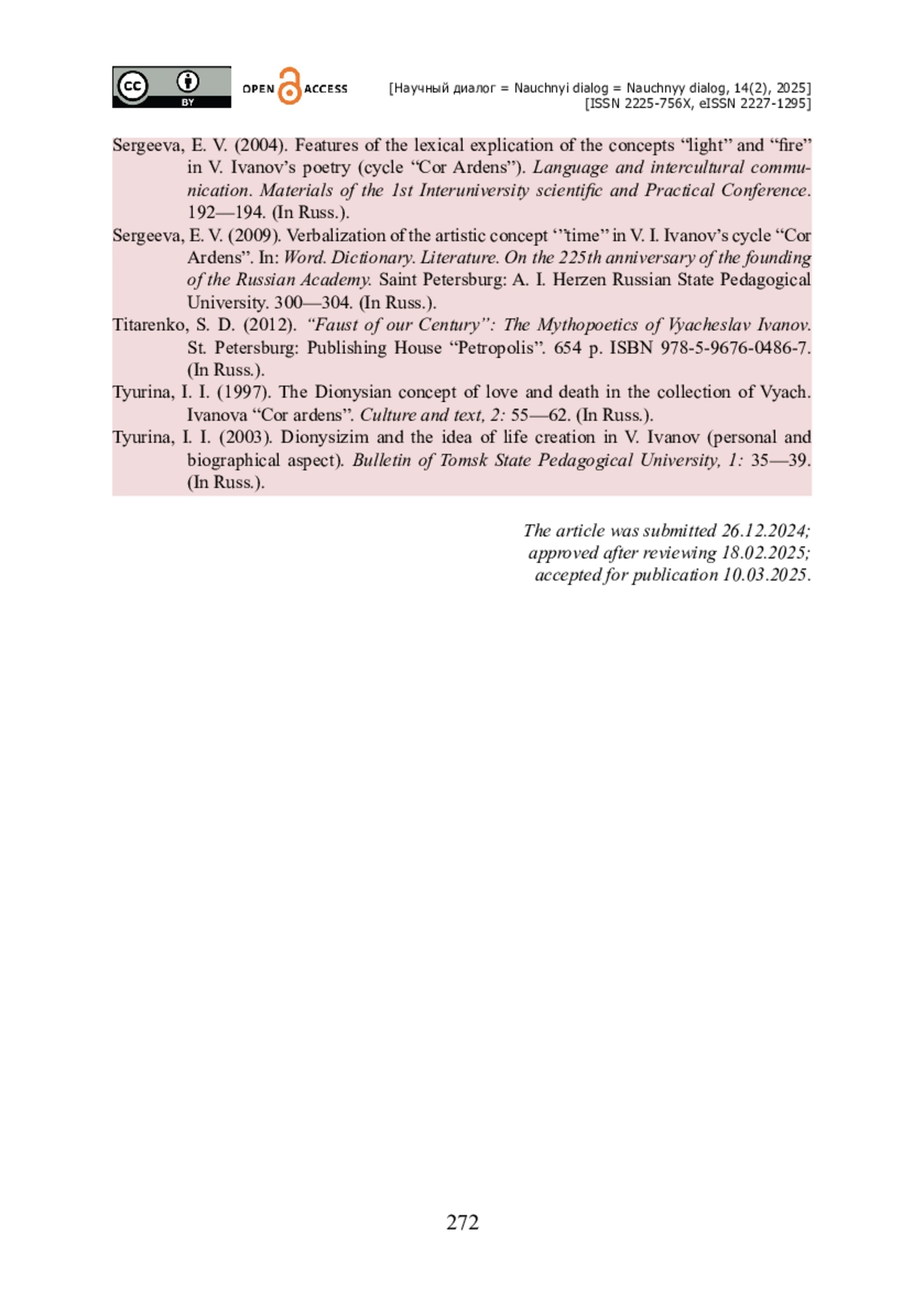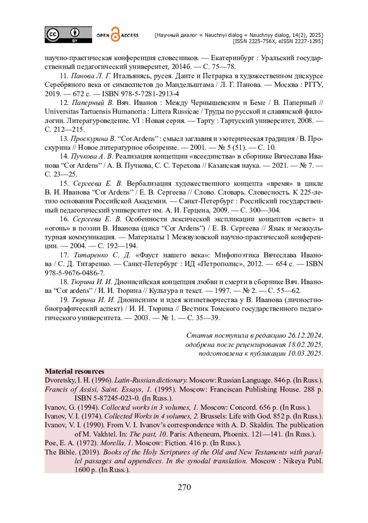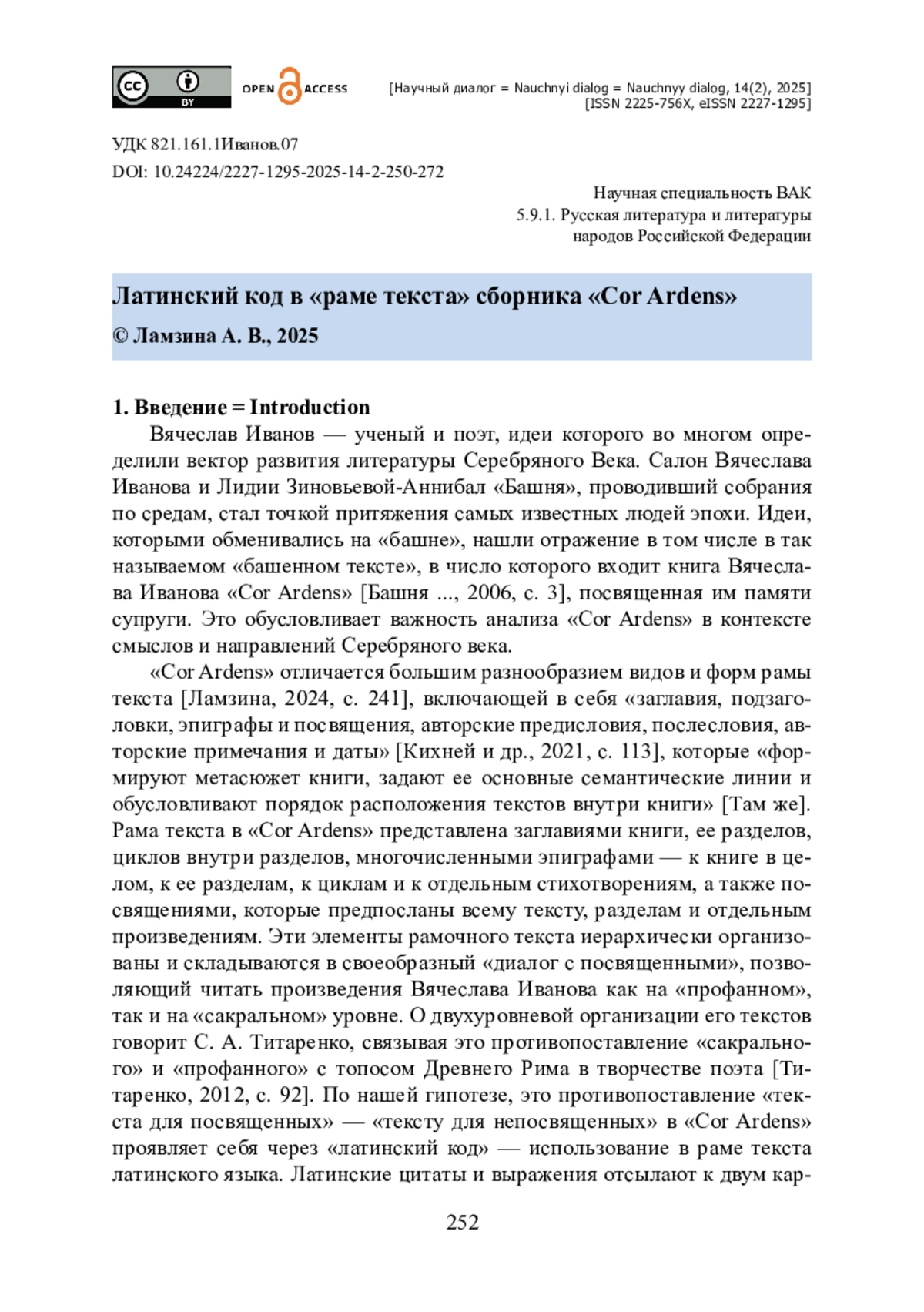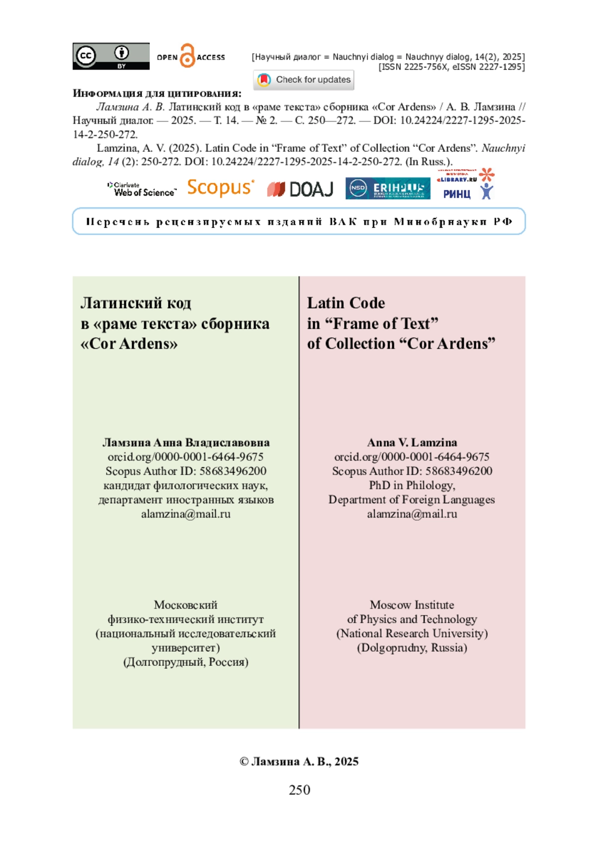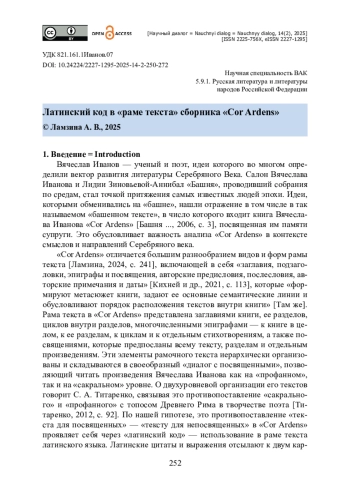 ЛАМЗИНА А. В. ЛАТИНСКИЙ КОД В «РАМЕ ТЕКСТА» СБОРНИКА «COR ARDENS» // НАУЧНЫЙ ДИАЛОГ. 2025. ТОМ 14, № 2