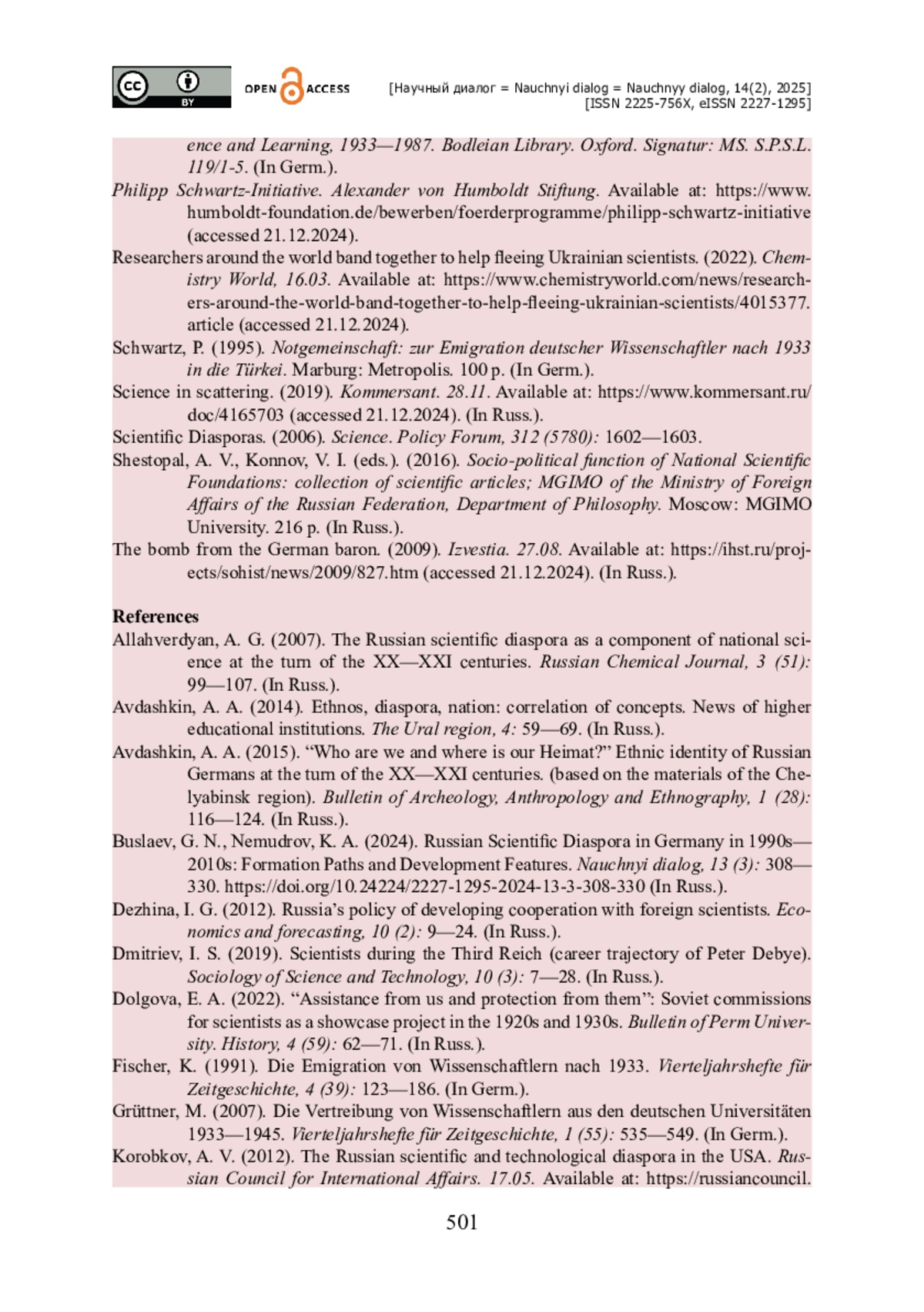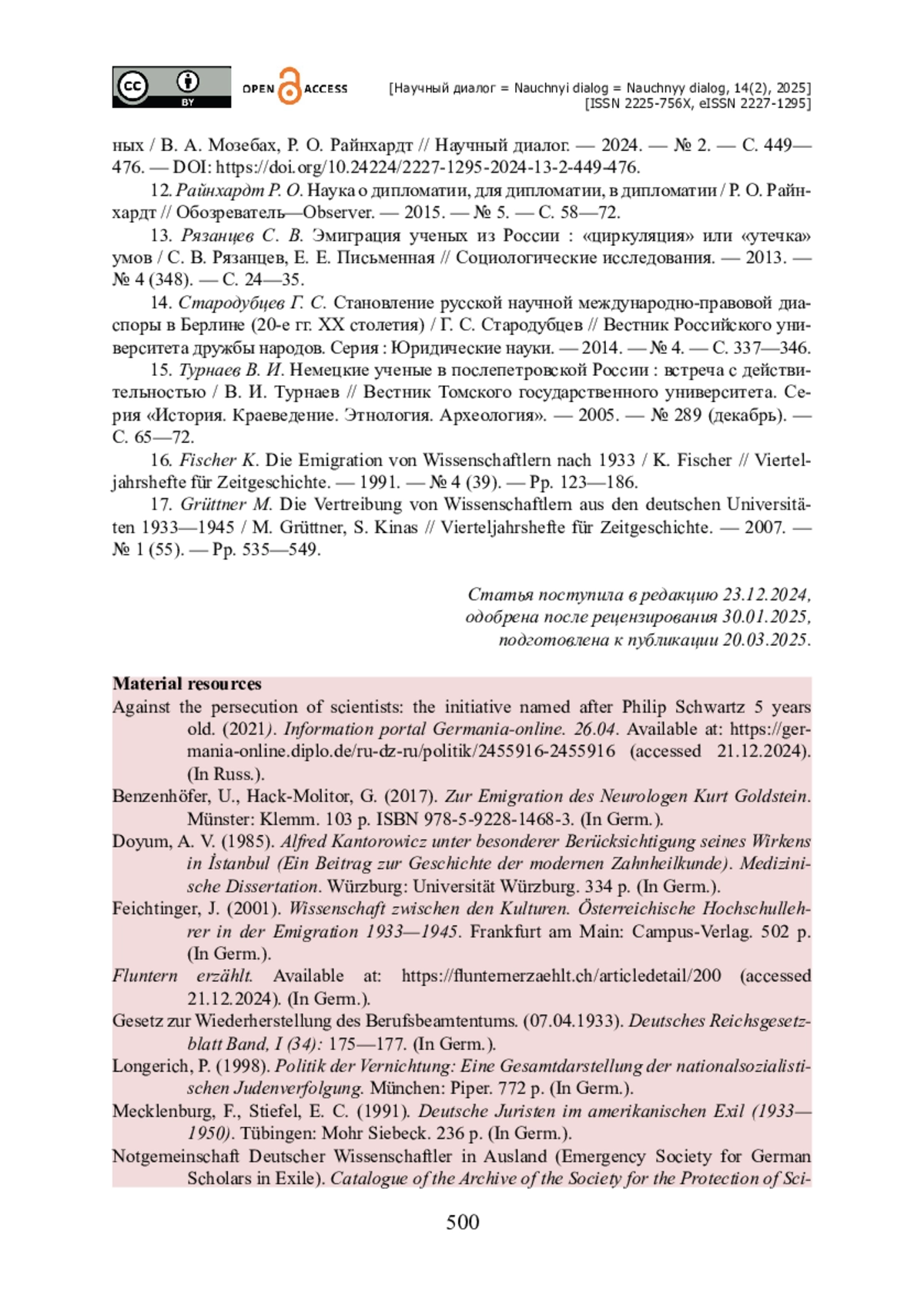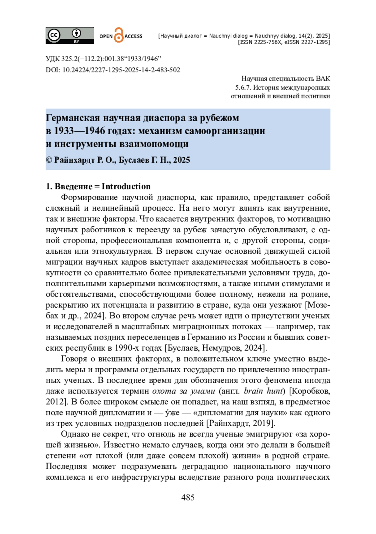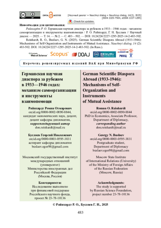 БУСЛАЕВ Г. Н. ГЕРМАНСКАЯ НАУЧНАЯ ДИАСПОРА ЗА РУБЕЖОМ В 1933—1946 ГОДАХ: МЕХАНИЗМ САМООРГАНИЗАЦИИ И ИНСТРУМЕНТЫ ВЗАИМОПОМОЩИ // НАУЧНЫЙ ДИАЛОГ. 2025. ТОМ 14, № 2