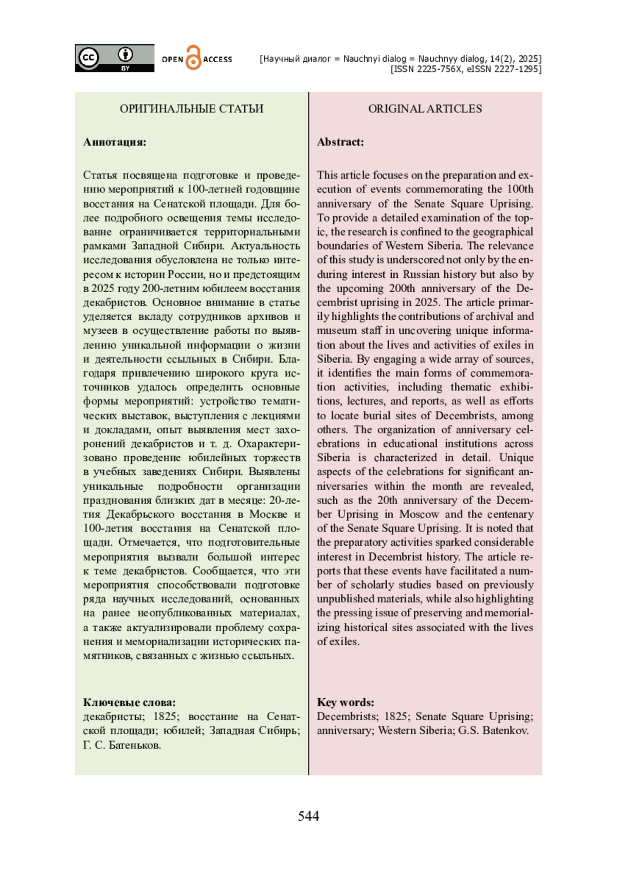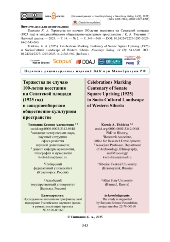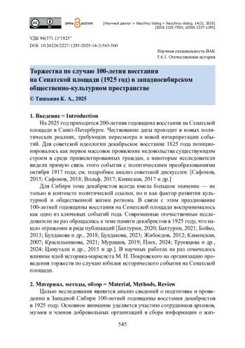 Статья посвящена подготовке и проведению мероприятий к 100-летней годовщине восстания на Сенатской площади. Для более подробного освещения темы исследование ограничивается территориальными рамками Западной Сибири. Актуальность исследования обусловлена не только интересом к истории России, но и предстоящим в 2025 году 200-летним юбилеем восстания декабристов. Основное внимание в статье уделяется вкладу сотрудников архивов и музеев в осуществление работы по выявлению уникальной информации о жизни и деятельности ссыльных в Сибири. Благодаря привлечению широкого круга источников удалось определить основные формы мероприятий: устройство тематических выставок, выступления с лекциями и докладами, опыт выявления мест захоронений декабристов и т. д. Охарактеризовано проведение юбилейных торжеств в учебных заведениях Сибири. Выявлены уникальные подробности организации празднования близких дат в месяце: 20-летия Декабрьского восстания в Москве и 100-летия восстания на Сенатской площади. Отмечается, что подготовительные мероприятия вызвали большой интерес к теме декабристов. Сообщается, что эти мероприятия способствовали подготовке ряда научных исследований, основанных на ранее неопубликованных материалах, а также актуализировали проблему сохранения и мемориализации исторических памятников, связанных с жизнью ссыльных.