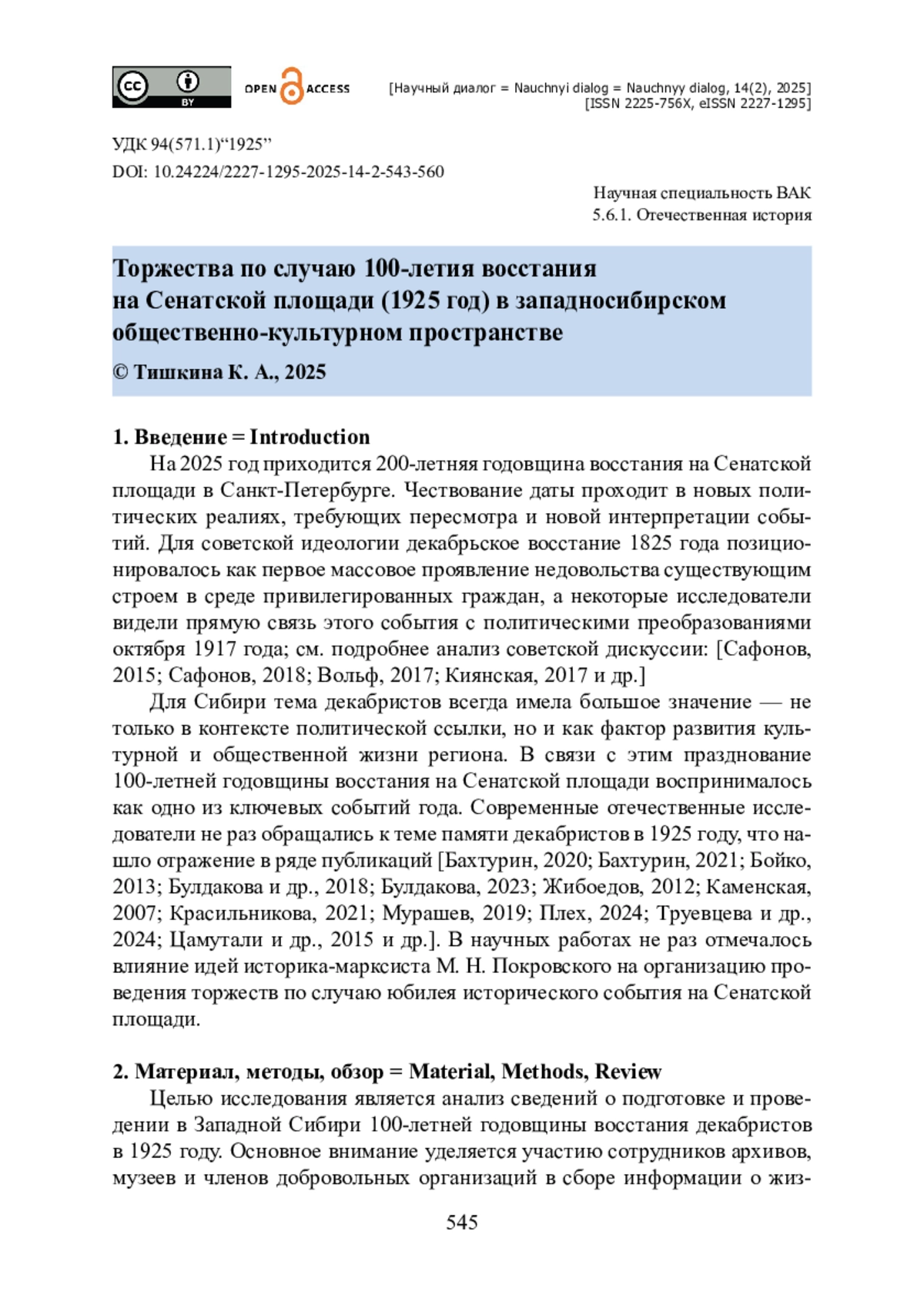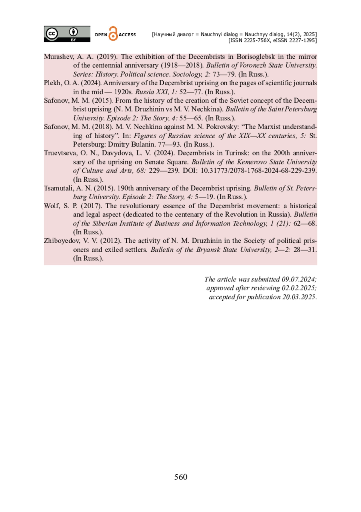 12. Плех О. А. Юбилей восстания декабристов на страницах научных журналов середины 1920-х гг. / О. А. Плех // Россия XXI. - 2024. - № 1. - С. 52-77.