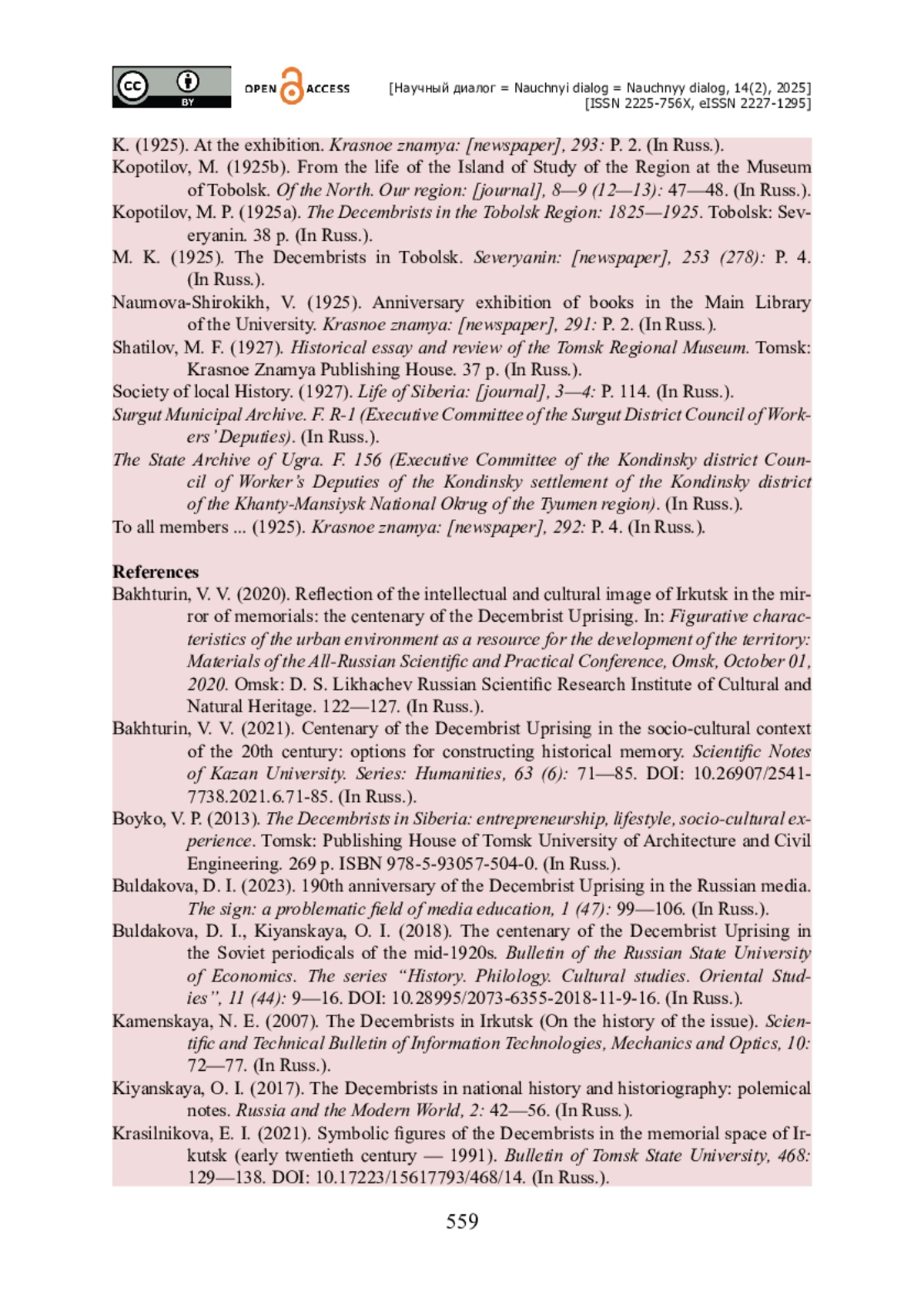 2. Бахтурин В. В. Столетний юбилей восстания декабристов в социокультурном контексте 20-х годов XX века : варианты конструирования исторической памяти / В. В. Бахтурин // Ученые записки Казанского университета. Серия : Гуманитарные науки. - 2021. - Т. 163. - № 6. - С. 71-85. - https://doi.org/10.26907/2541-7738.2021.6.71-85.
