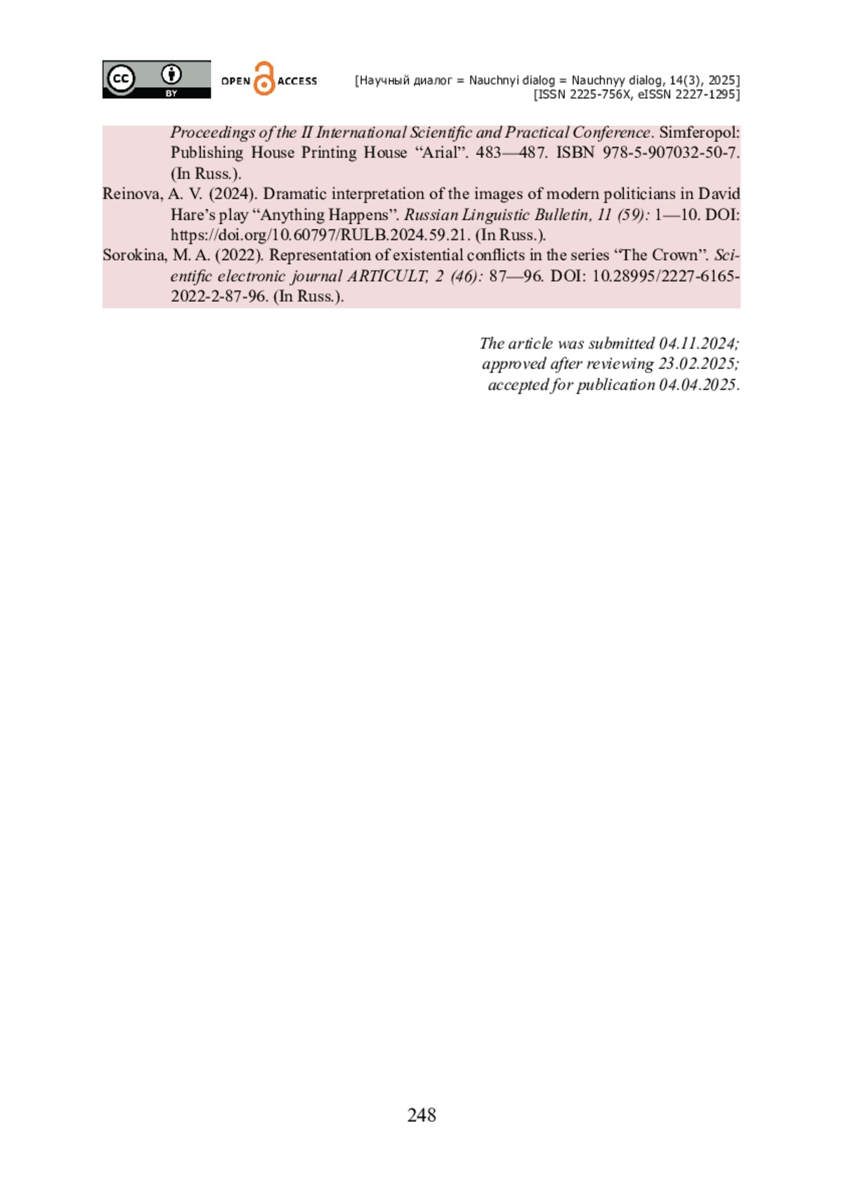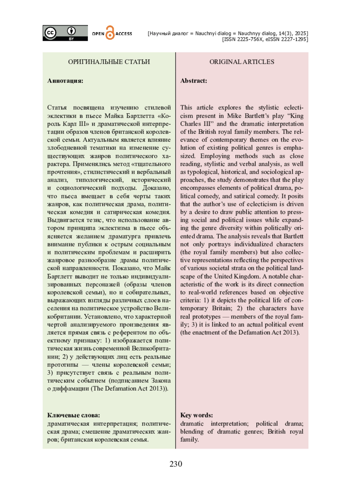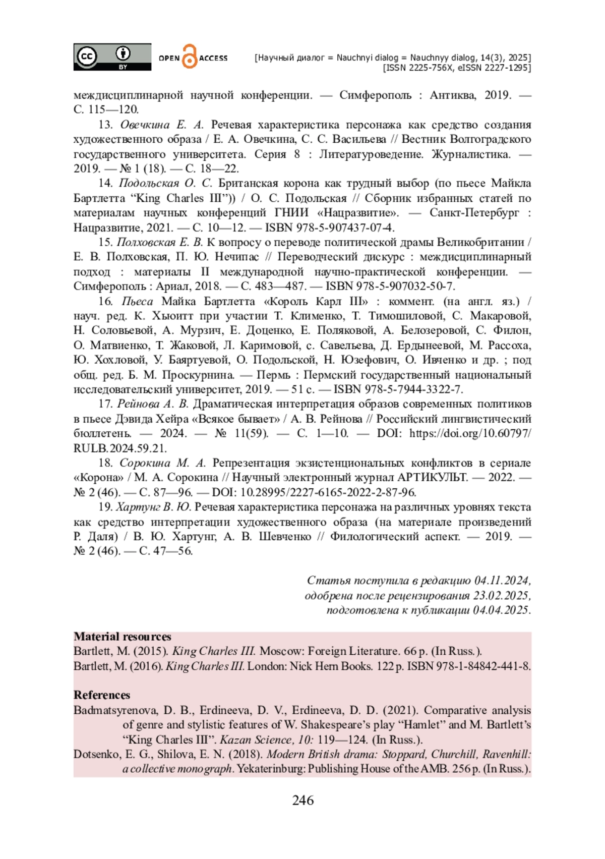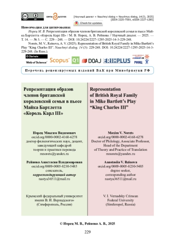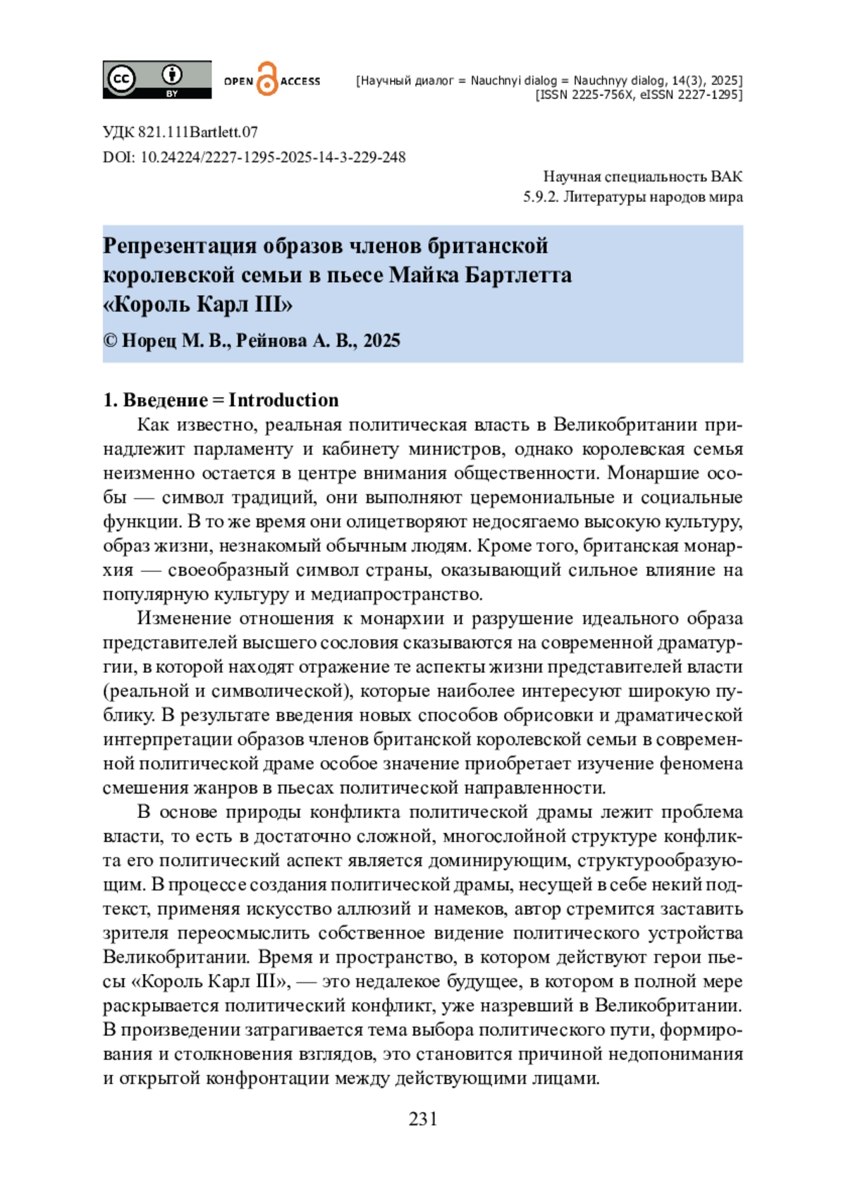 НОРЕЦ М. В., РЕЙНОВА А. В. РЕПРЕЗЕНТАЦИЯ ОБРАЗОВ ЧЛЕНОВ БРИТАНСКОЙ КОРОЛЕВСКОЙ СЕМЬИ В ПЬЕСЕ МАЙКА БАРТЛЕТТА «КОРОЛЬ КАРЛ III» // НАУЧНЫЙ ДИАЛОГ. 2025. ТОМ 14, № 3