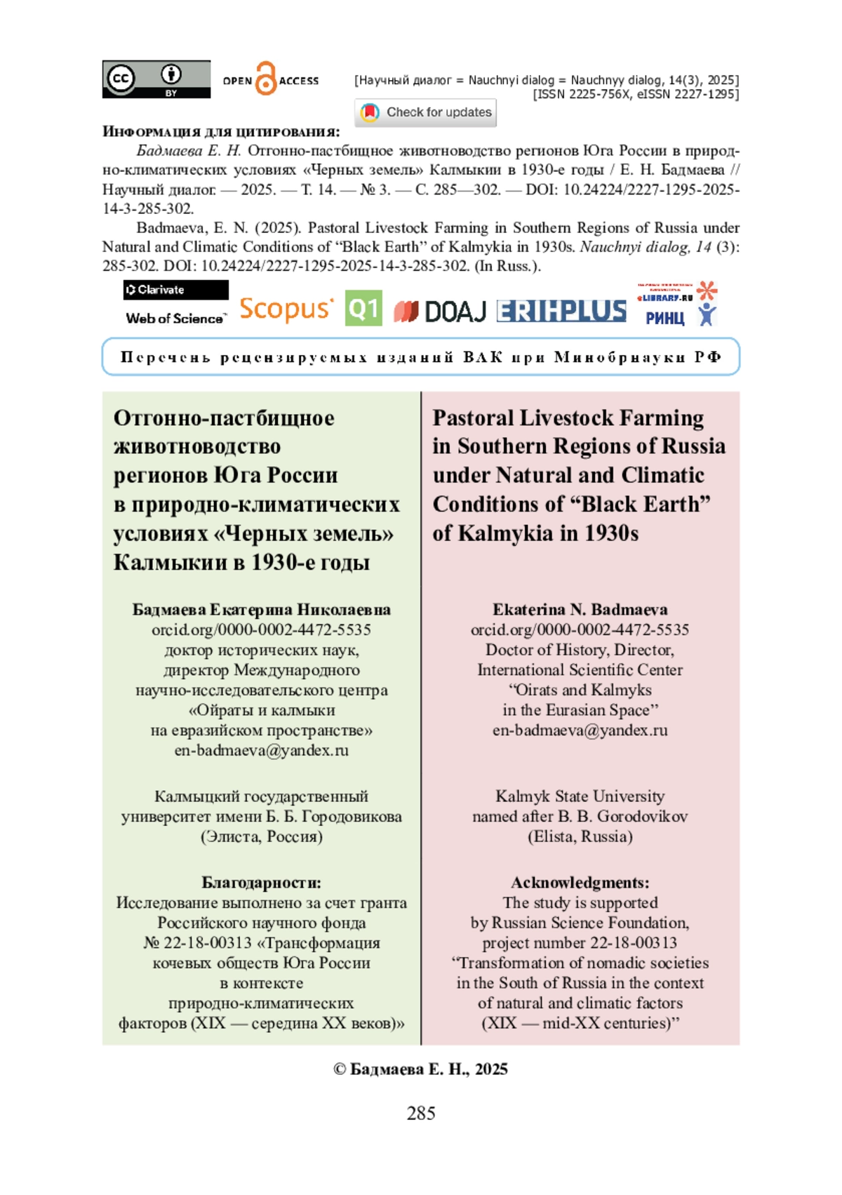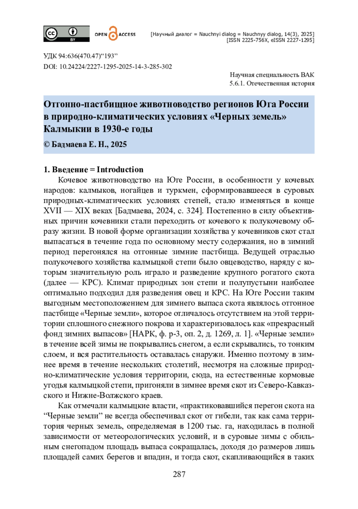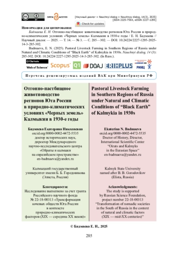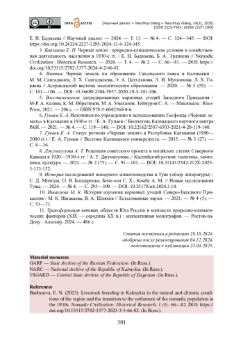 1. Бадмаева Е. Н. Животноводство Калмыкии в природно-климатических условиях региона и переход на оседлость кочевого населения в 1930-е гг. / Е. Н. Бадмаева // Nomadic Civilization: Historical Research. - 2023. - Т. 3. - № 3. - С. 66-82. - https://doi.org/10.53315/2782-3377-2023-3-3-66-82.