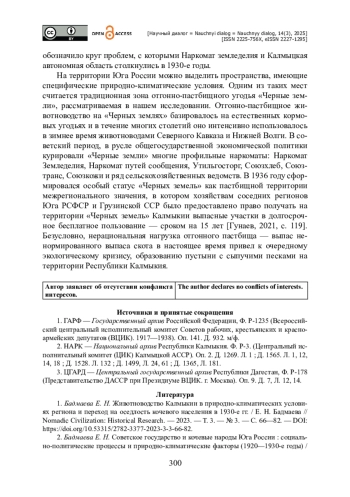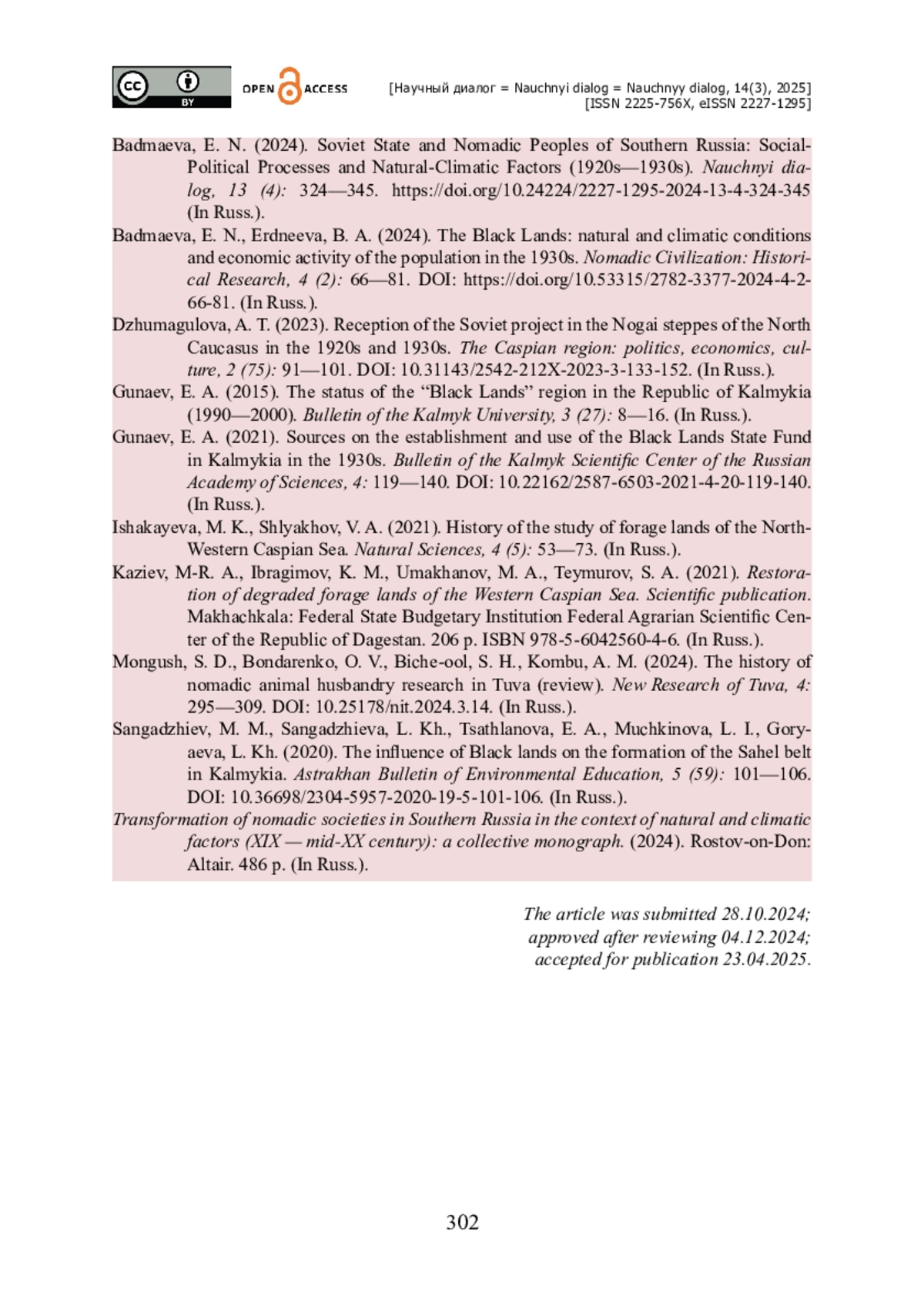 2. Бадмаева Е. Н. Советское государство и кочевые народы Юга России : социально-политические процессы и природно-климатические факторы (1920-1930-е годы) / Е. Н. Бадмаева // Научный диалог. - 2024. - Т. 13. - № 4. - С. 324-345. - https://doi.org/10.24224/2227-1295-2024-13-4-324-345.