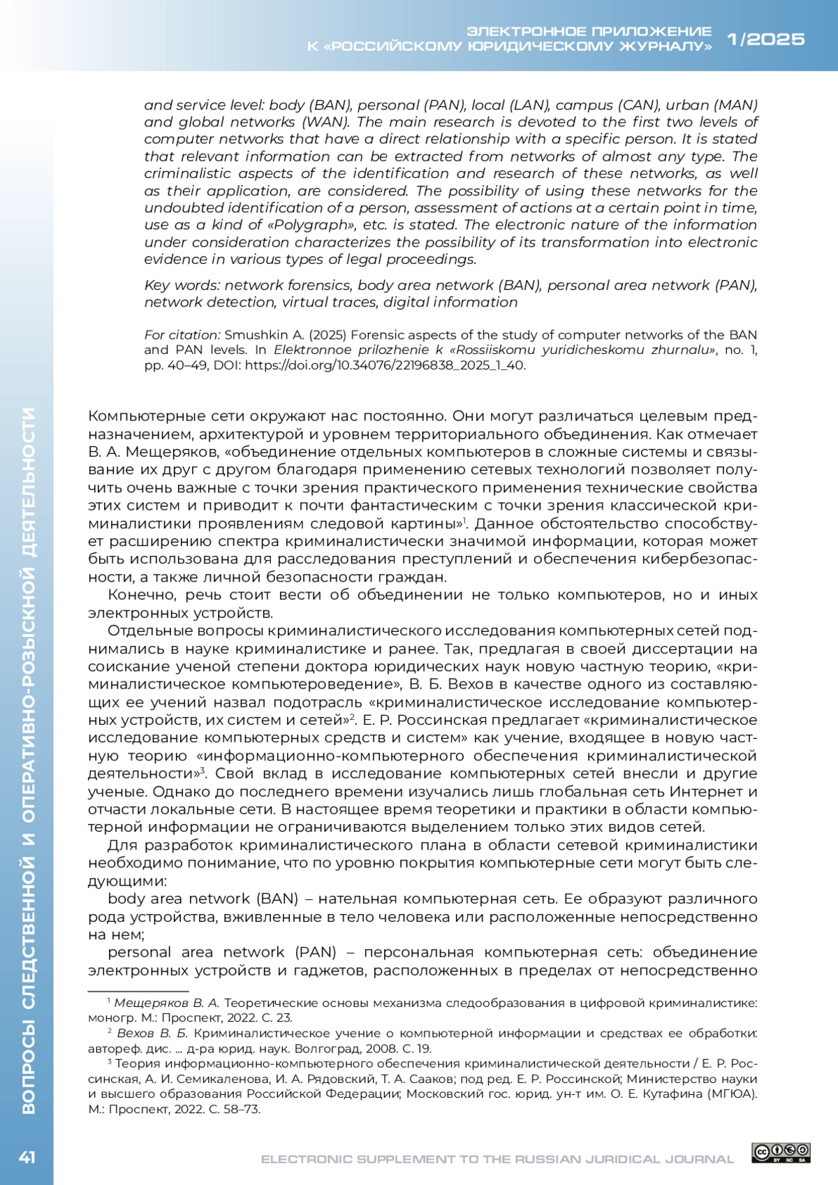 Автор констатирует расширение спектра криминалистически значимой информации, которая может быть использована для расследования преступлений и обеспечения кибербезопасности и личной безопасности граждан за счет сетевой информации. При рассмотрении основных монографических исследований, связанных с выделением сетевой криминалистики (криминалистического исследования компьютерных систем и сетей) в качестве самостоятельного раздела, указано, что до последнего времени исследованию подвергались лишь глобальная сеть Интернет и отчасти локальные сети. Между тем выделяется более широкий спектр сетей по функционалу и уровню обслуживания: нательная (BAN), персональная (PAN), локальная (LAN), кампусная (CAN), городская (MAN) и глобальная сети (WAN). Основное внимание уделено двум первым уровням компьютерных сетей, имеющим непосредственную взаимосвязь с конкретным человеком. Утверждается, что релевантная информация может быть извлечена из сетей практически любого типа. Рассмотрены криминалистические аспекты выявления и исследования данных сетей, а также их применения. Анализируется возможность использования этих сетей для несомненной идентификации человека, оценки действий в определенный момент времени и др. Электронная природа обозначенной информации характеризует возможность ее трансформации в электронные доказательства в различных видах судопроизводства.