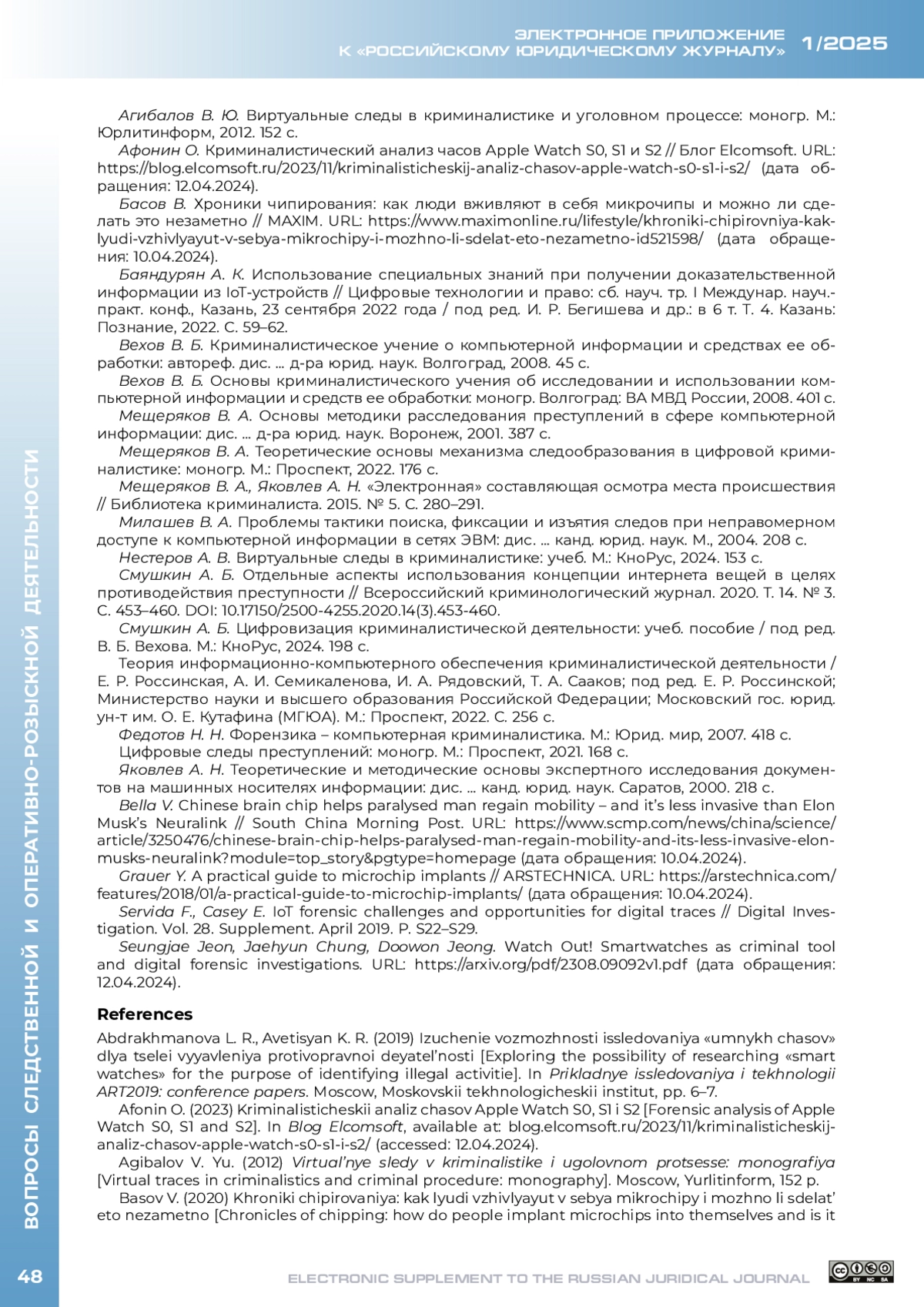 1. Абдрахманова Л. Р., Аветисян К. Р. Изучение возможности исследования “умных часов” для целей выявления противоправной деятельности // Прикладные исследования и технологии ART2019: сб. тр. регион. конф., Москва, 1-2 апреля 2019 года. М.: Московский технол. ин-т, 2019. С. 6-7. EDN: ZBAJSX