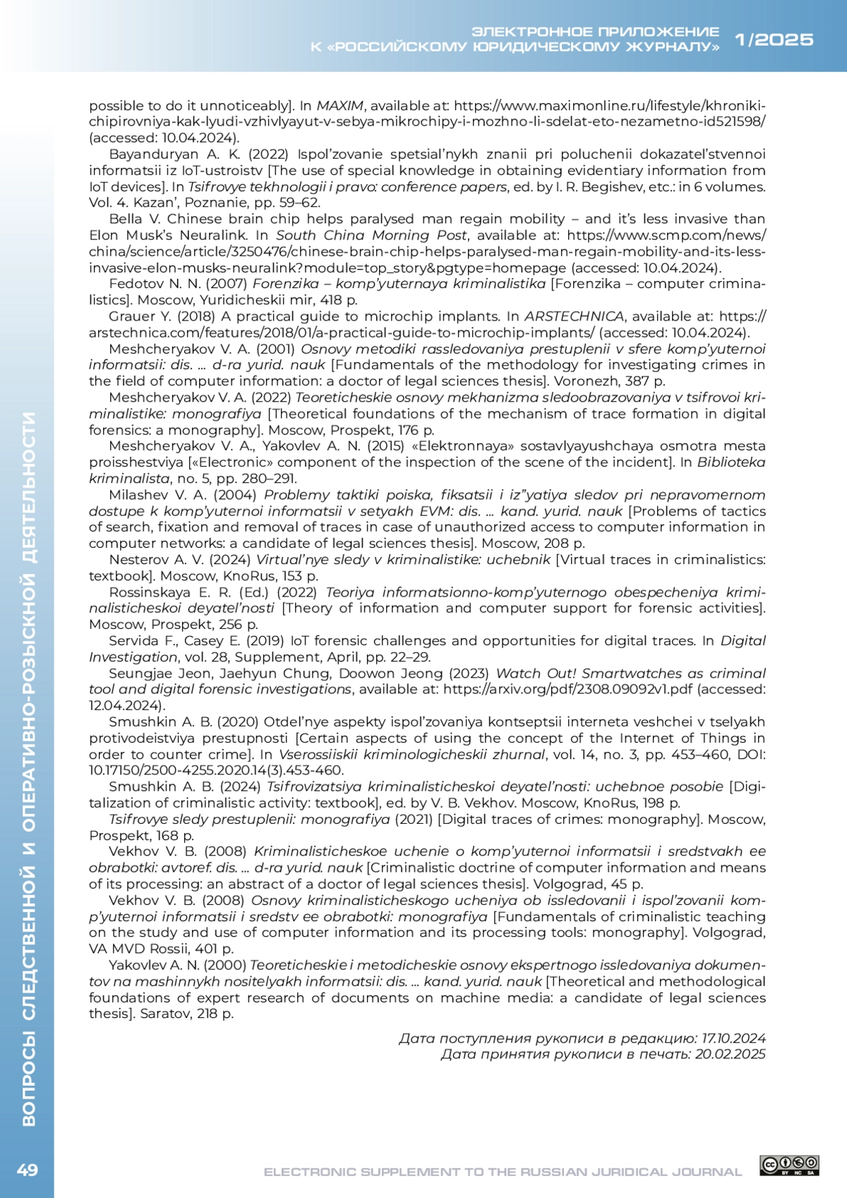 10. Мещеряков В. А., Яковлев А. Н. “Электронная” составляющая осмотра места происшествия // Библиотека криминалиста. 2015. № 5. С. 280-291.