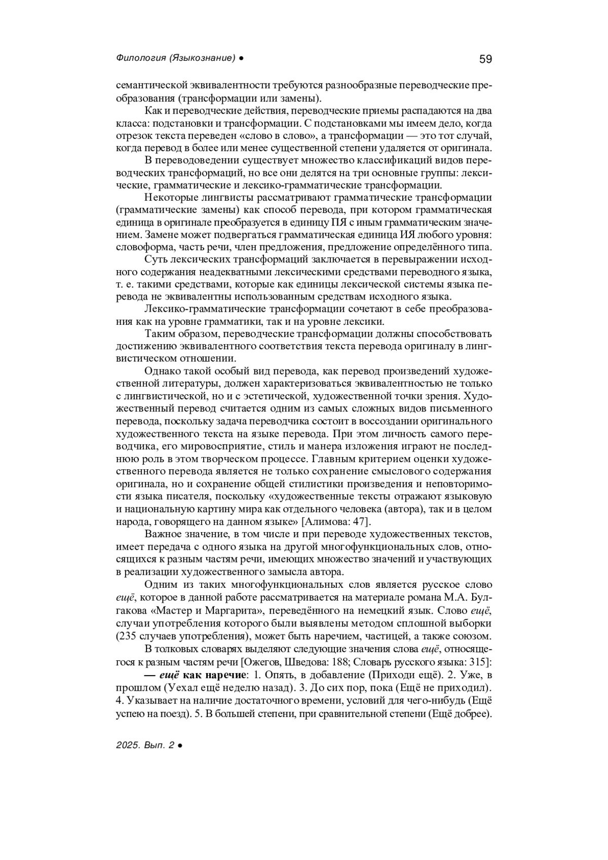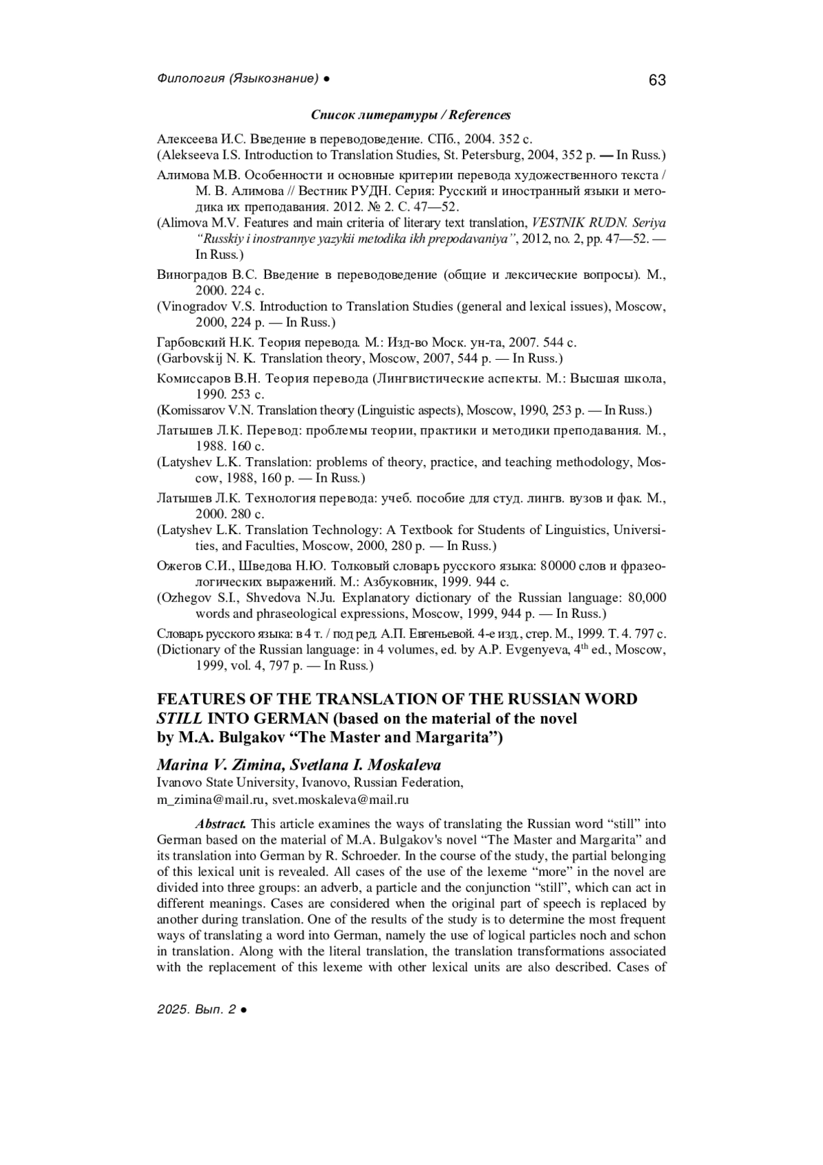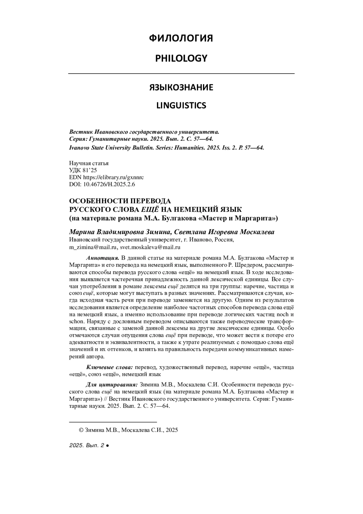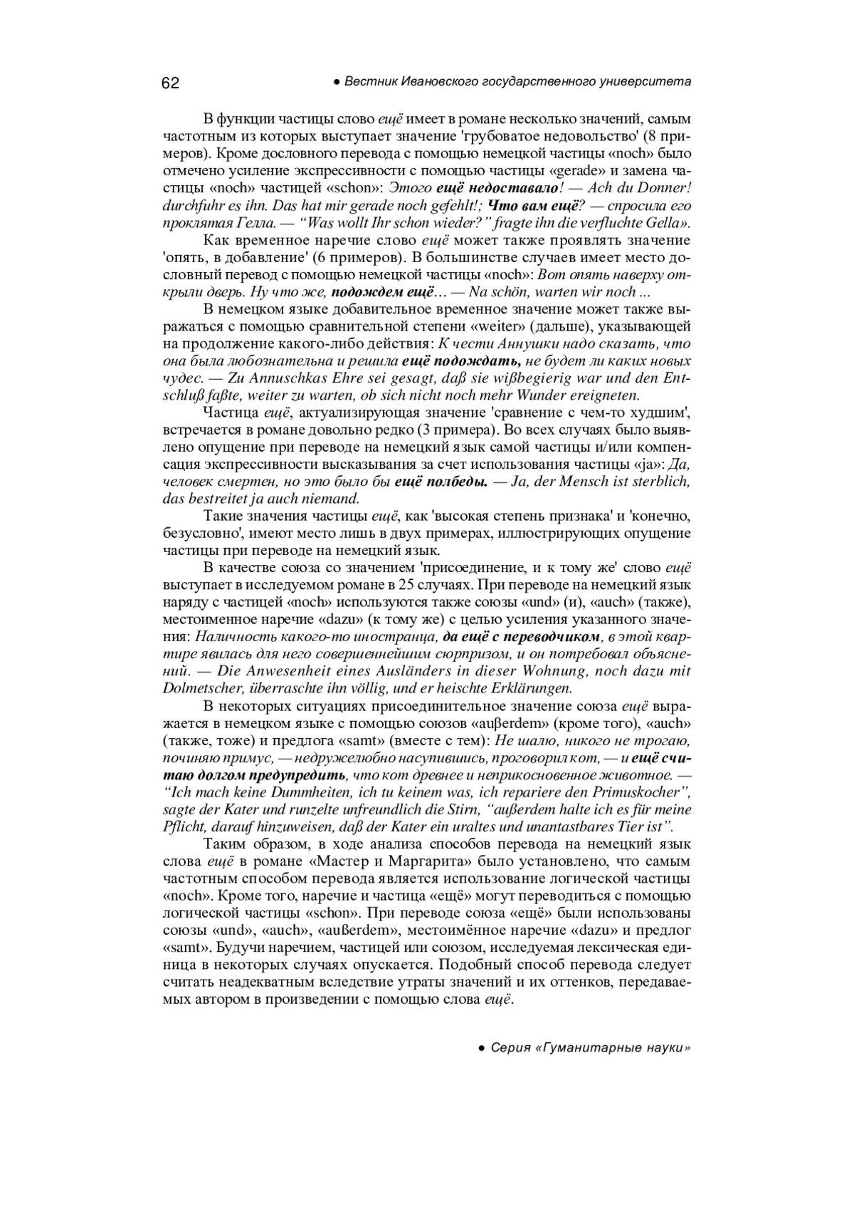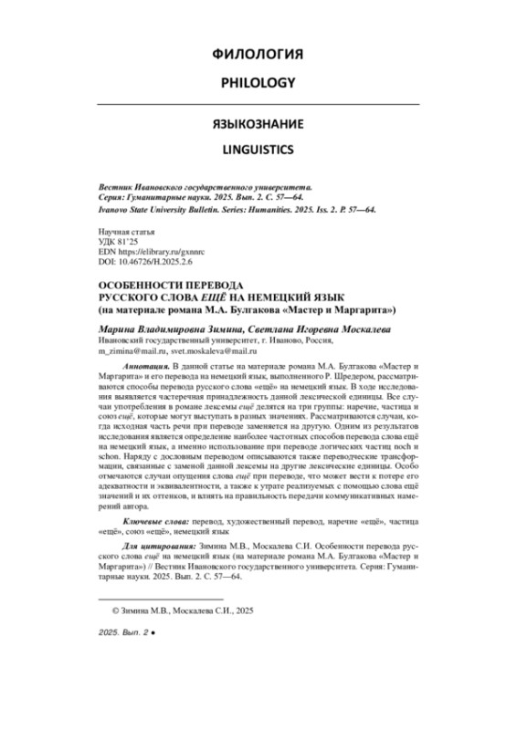 В данной статье на материале романа М. А. Булгакова «Мастер и Маргарита» и его перевода на немецкий язык, выполненного Р. Шредером, рассматриваются способы перевода русского слова «ещё» на немецкий язык. В ходе исследования выявляется частеречная принадлежность данной лексической единицы. Все случаи употребления в романе лексемы ещё делятся на три группы: наречие, частица и союз ещё, которые могут выступать в разных значениях. Рассматриваются случаи, когда исходная часть речи при переводе заменяется на другую. Одним из результатов исследования является определение наиболее частотных способов перевода слова ещё на немецкий язык, а именно использование при переводе логических частиц noch и schon. Наряду с дословным переводом описываются также переводческие трансформации, связанные с заменой данной лексемы на другие лексические единицы. Особо отмечаются случаи опущения слова ещё при переводе, что может вести к потере его адекватности и эквивалентности, а также к утрате реализуемых с помощью слова ещё значений и их оттенков, и влиять на правильность передачи коммуникативных намерений автора.