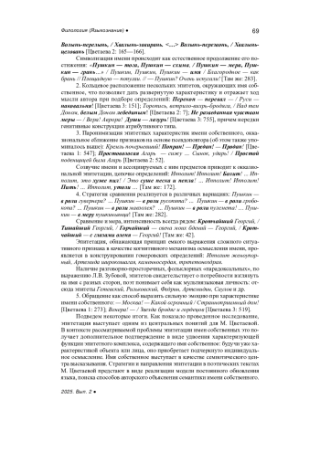 Статья посвящена исследованию специфики эпитетации имен собственных в поэзии Марины Цветаевой. В работе устанавливается, что ориентированное на качественную характеристику имя собственное в результате эпитетации предстает как семиотический центр высказывания. Стратегии и направления эпитетации в поэтических текстах М. Цветаевой предстают в виде реализации модели постоянного обновления языка, поиска способов авторского объяснения семантики имени собственного. Обращается внимание на субъективную значимость для поэта имен собственных, что влияет как на их состав, так и на мотивацию ассоциирования признаков, связанных с ними. В статье представлен обзор основных направлений эпитетации имен собственных, а также их языковая репрезентация. Отмечается, что в поэтических текстах М. Цветаевой актуализация имени собственного посредством его особой эпитетации вербализуется как структурными способами (кольцевой эпитет, повтор эпитетов, построение цепочек определений, обращения и др.), так и семантическими (подбор эпитетов-паронимов, игра со смыслами имени собственного). Делается вывод о том, что эпитетация предстает одним из основных способов поиска и актуализации необходимого смысла в поэзии М. Цветаевой и принципом поэтического мышления поэта в целом