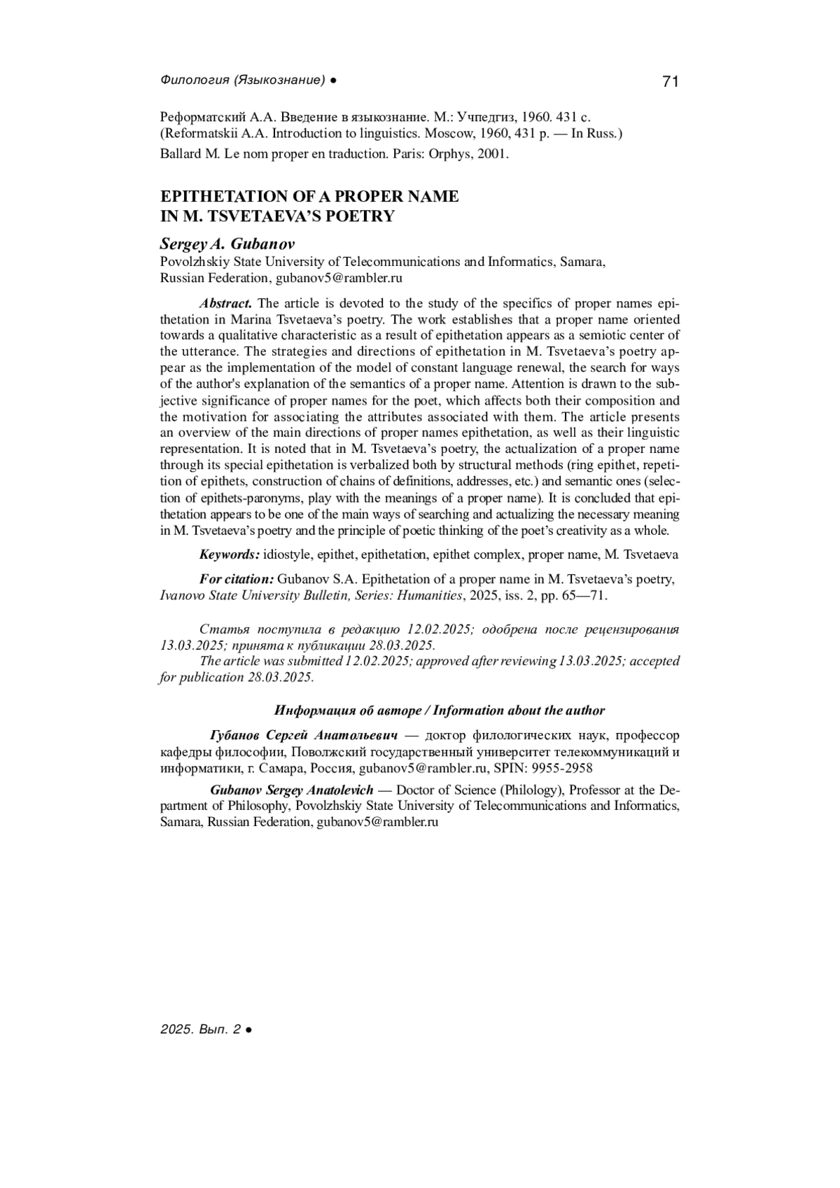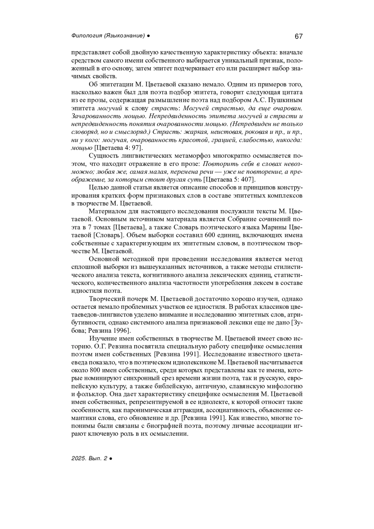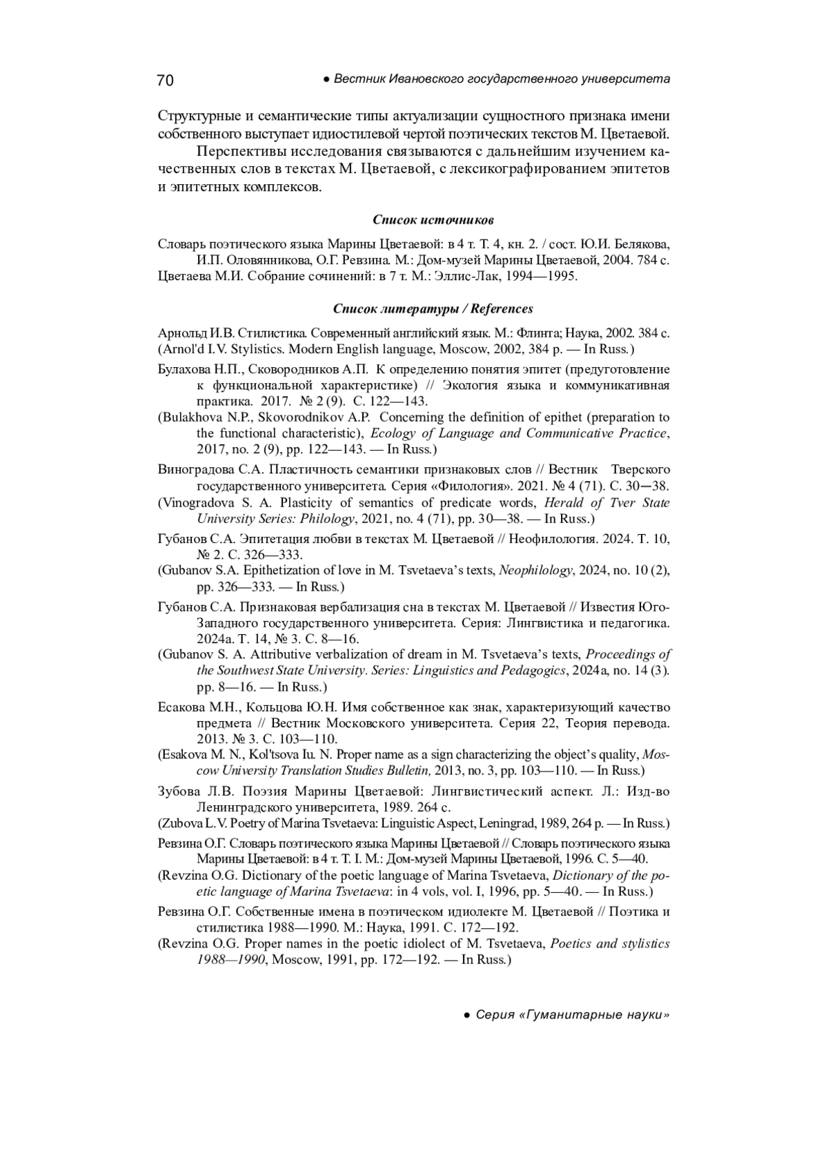6. Губанов С.А. Эпитетация любви в текстах М. Цветаевой // Неофилология. 2024. Т. 10, № 2. С. 326-333. EDN: FZQQEW