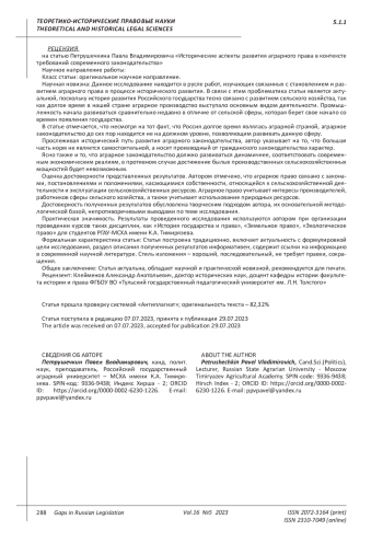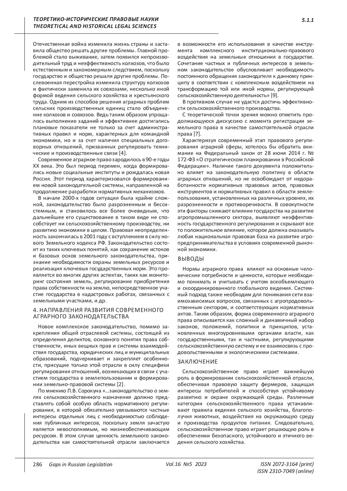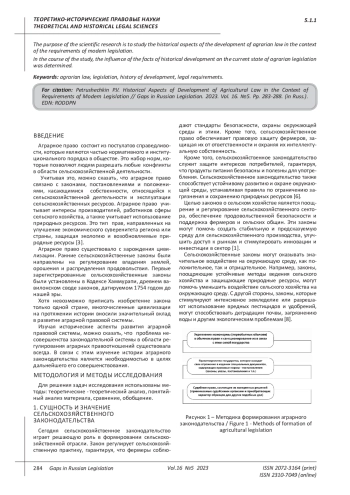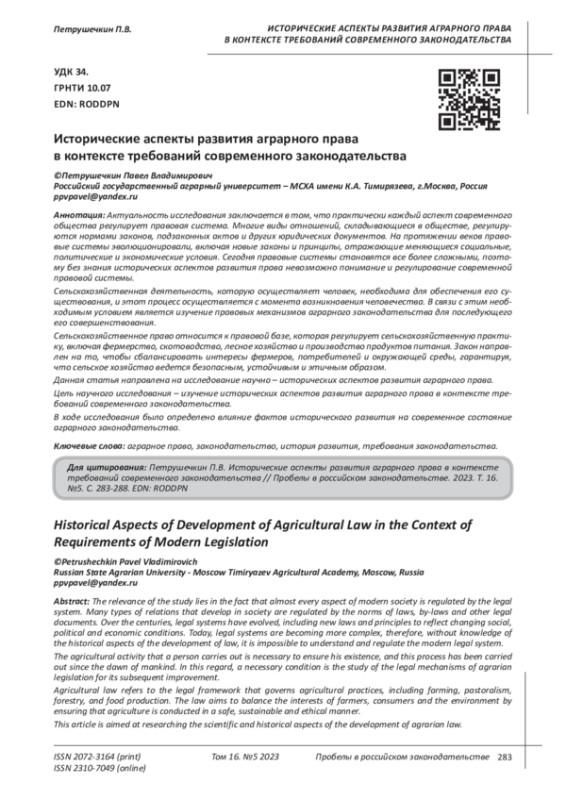 Статья: ИСТОРИЧЕСКИЕ АСПЕКТЫ РАЗВИТИЯ АГРАРНОГО ПРАВА В КОНТЕКСТЕ ТРЕБОВАНИЙ СОВРЕМЕННОГО ЗАКОНОДАТЕЛЬСТВА (2023)