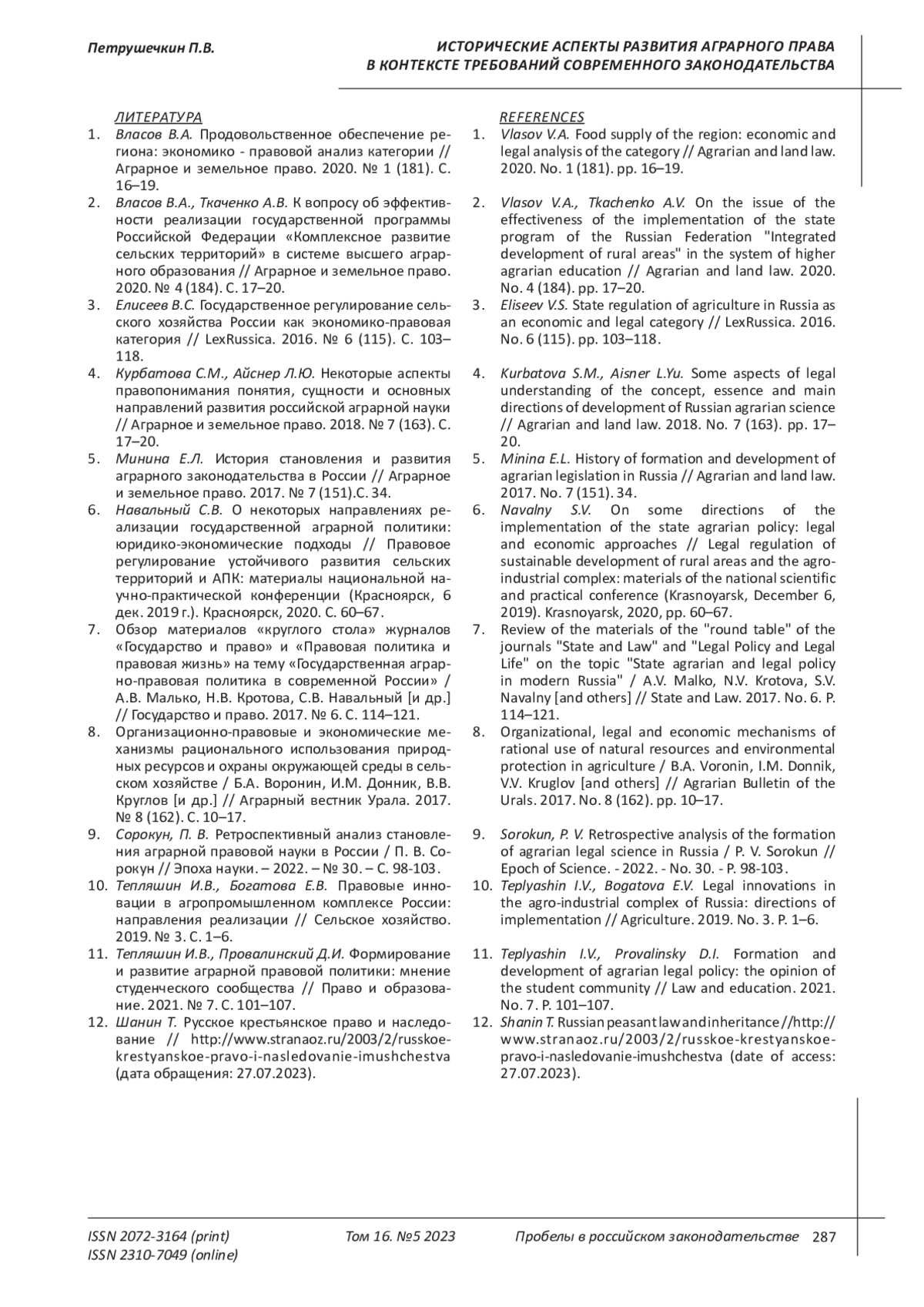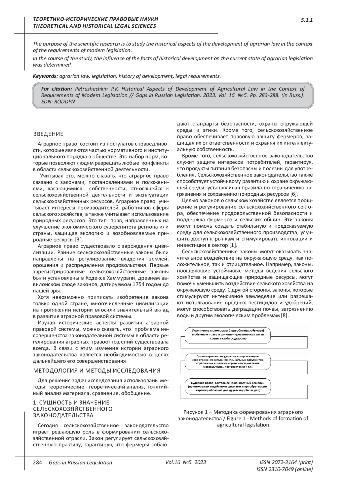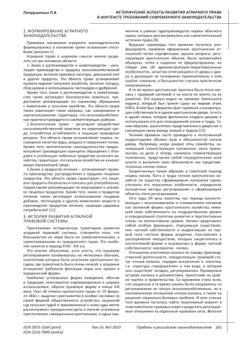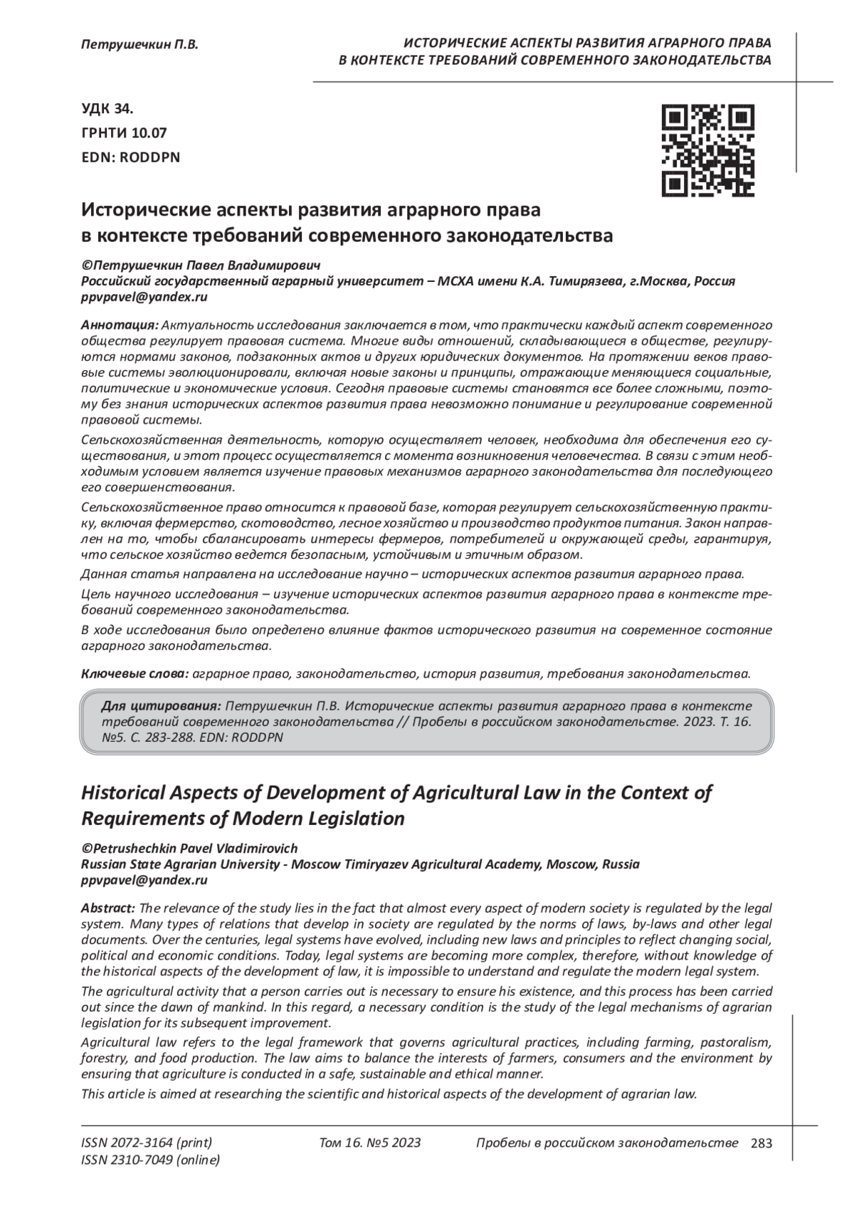 ПЕТРУШЕЧКИН П. В. ИСТОРИЧЕСКИЕ АСПЕКТЫ РАЗВИТИЯ АГРАРНОГО ПРАВА В КОНТЕКСТЕ ТРЕБОВАНИЙ СОВРЕМЕННОГО ЗАКОНОДАТЕЛЬСТВА // ПРОБЕЛЫ В РОССИЙСКОМ ЗАКОНОДАТЕЛЬСТВЕ. 2023. Т. 16 № 5