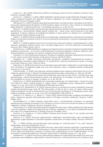 6. Балицкий К. С. Проблемы правового регулирования труда спортсменов и тренеров в Российской Федерации // Российский юридический журнал. 2010. № 3. С. 202-206. EDN: MICVRJ