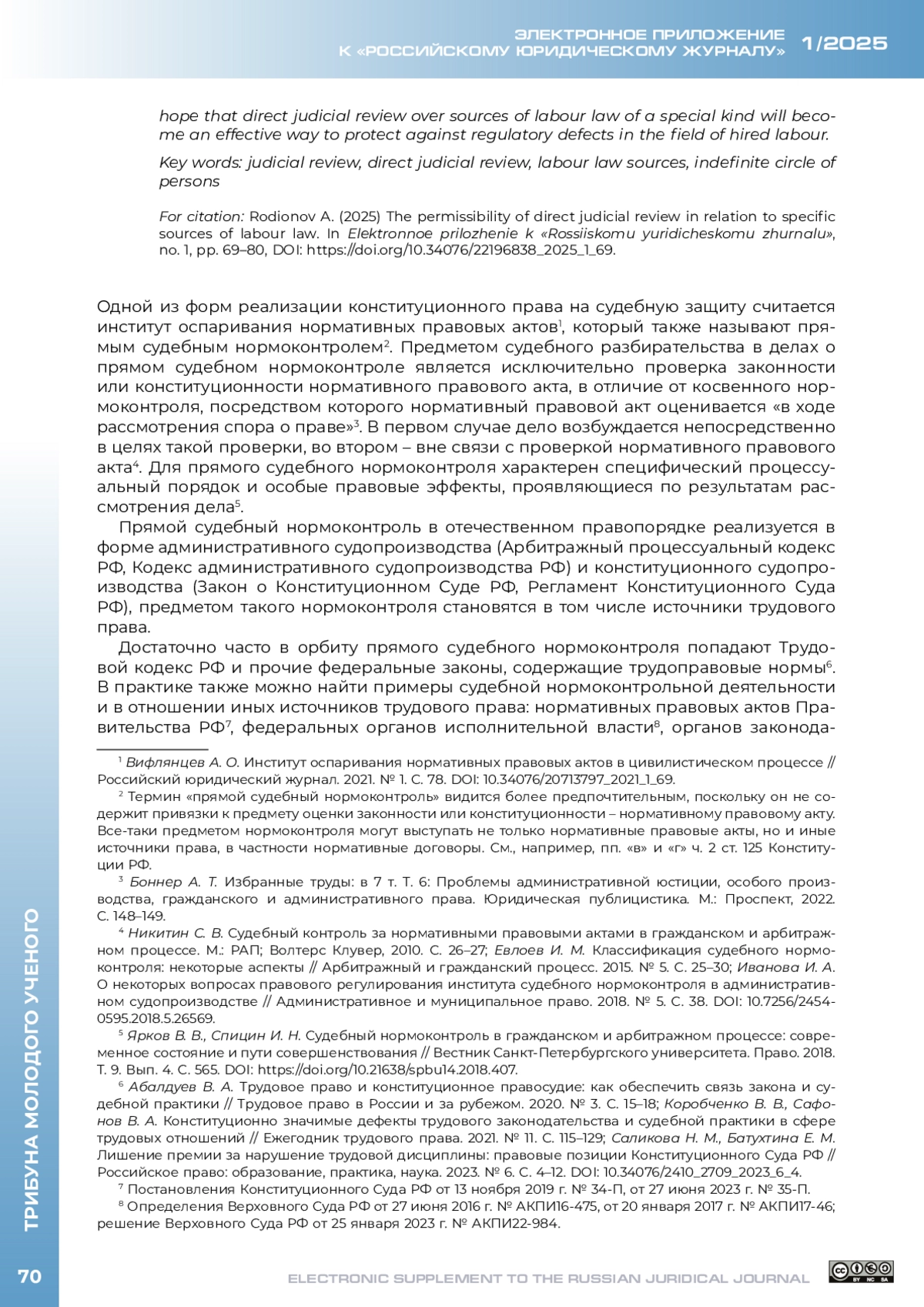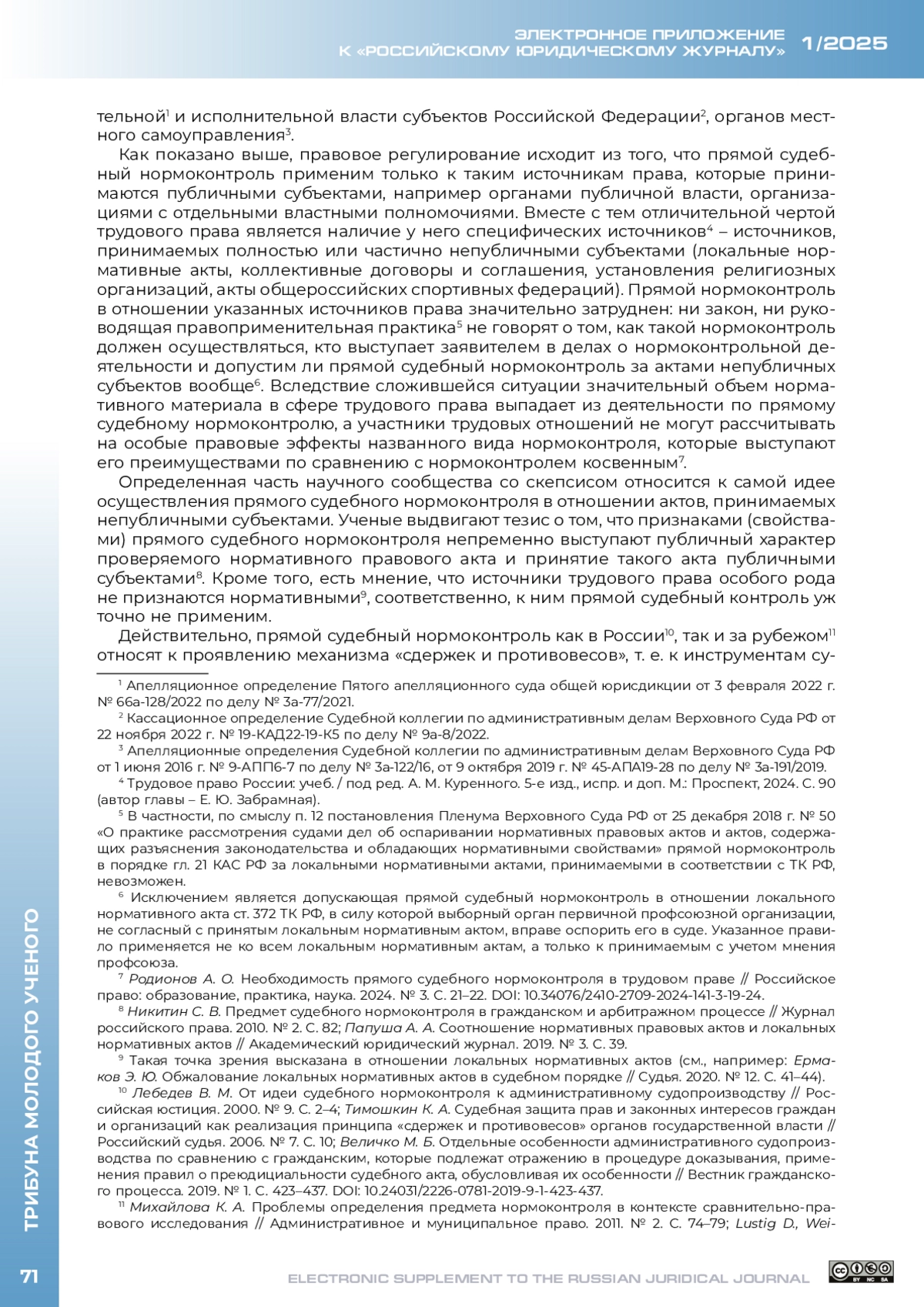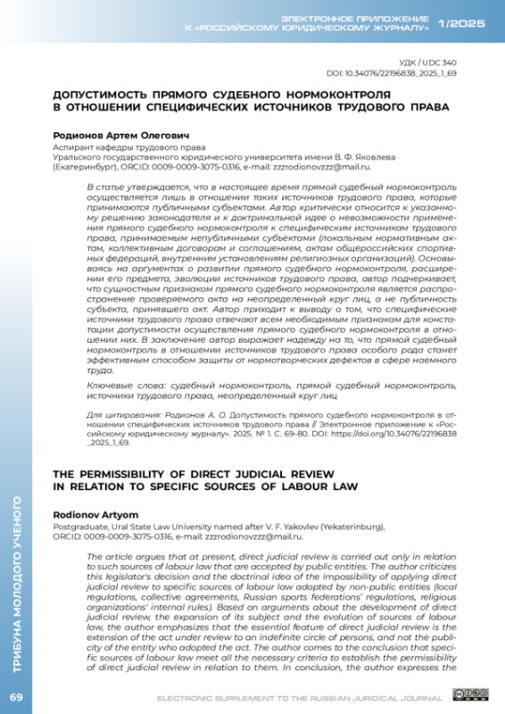 40. Родионов А. О. Необходимость прямого судебного нормоконтроля в трудовом праве // Российское право: образование, практика, наука. 2024. № 3. С. 19-24. DOI: 10.34076/2410-2709-2024141-3-19-24 EDN: HBXULY