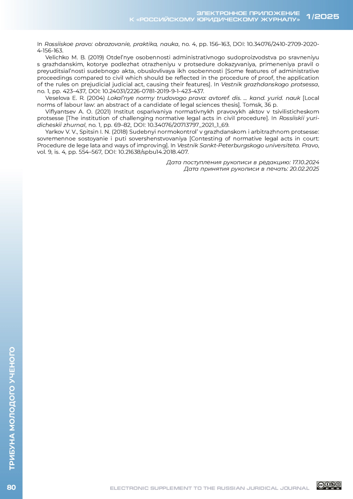 13. Вифлянцев А. О. Институт оспаривания нормативных правовых актов в цивилистическом процессе // Российский юридический журнал. 2021. № 1. С. 69-82. DOI: 10.34076/20713797_2021_1_69 EDN: ODUUBK