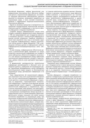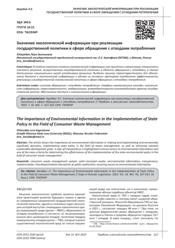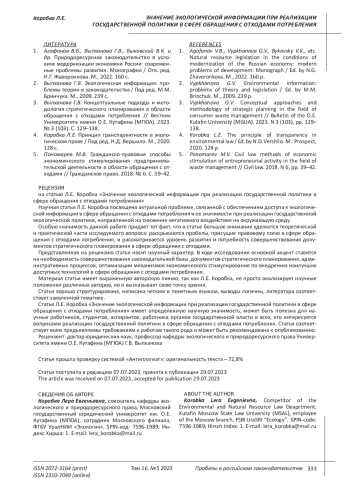 В статье показано значение экологической информации при принятии и реализации экологически значимых решений, осуществлении государственной политики в области обращения с отходами, а также достижении национальных целей устойчивого развития. Выделен признак транспарентности для обеспечения доступа к экологической информации и одного из основных критериев определения эффективности реализации государственной экологической политики в сфере обращения с отходами потребления.
